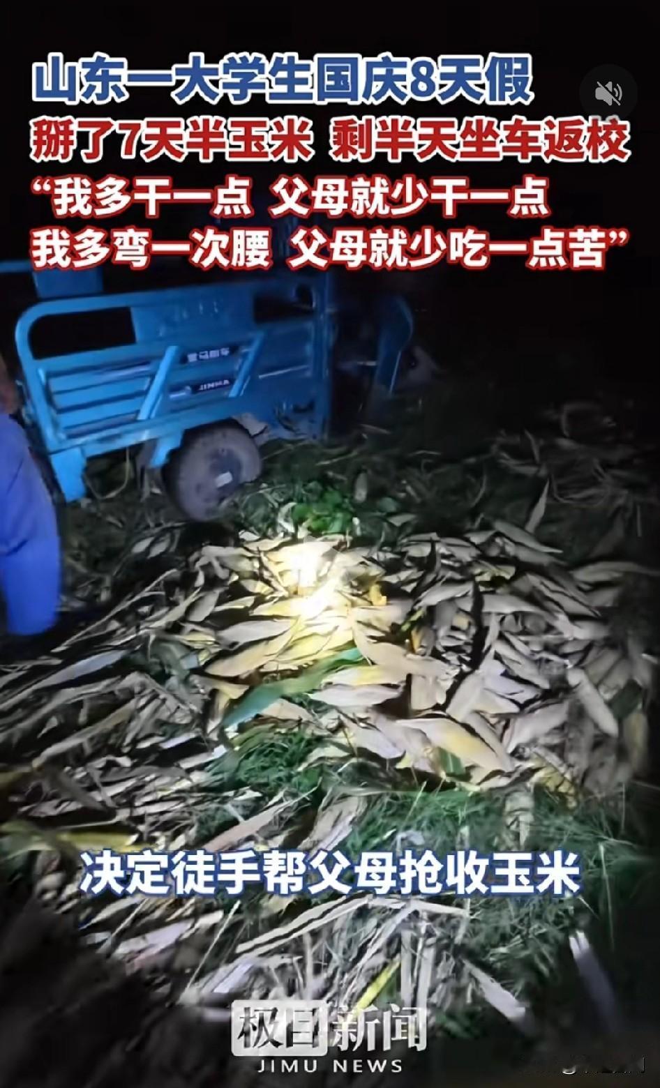 国庆8天休息大学生回家掰了7天玉米,没想到尽然上了热搜!大学生态度诚恳,多帮父母一点,就少点父母的劳累! 因为今年天气不好,地里长期粘湿进不了机器,所以今年玉米收的晚的都要动手干活,虽然一亩地玉米3000左右,但是自己收货的粮食不比轻易得来的踏实吗? 原来的我们不都是这样过来的吗,中秋一般都会赶上秋收,原来没机械的时候,秋收最累了,掰玉米,装车卸车,剥玉米,剥好了还得还得一趟趟往房上背,不过也挺充实[捂脸],现在轻松多了,和收麦子差不多了!