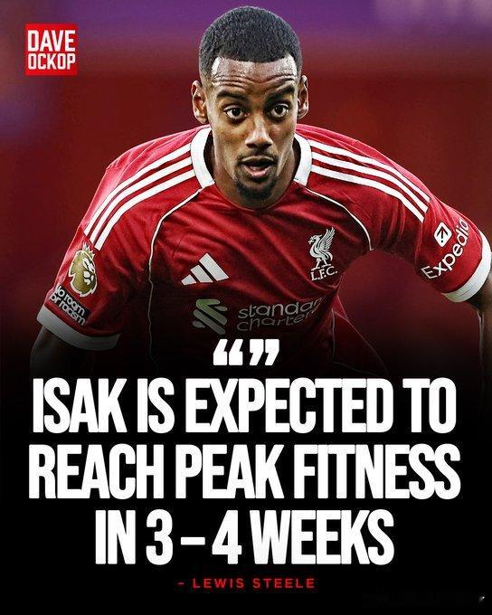每日邮报记者斯蒂勒透露伊萨克目前仍处于恢复阶段,预计需要三至四周才能达到最佳竞技状态。