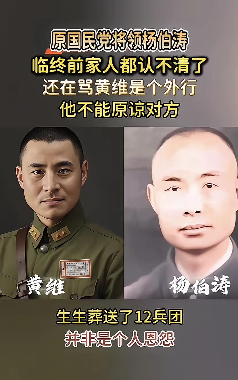 杨伯涛是个真正的军人,其军事能力卓越,虽然被刘邓大军包围后黄维兵团是完全有能力,可以突围出去的,因为刘邓大军装备太差根本难以抵挡,杨伯涛多次力主马上突围,结果黄维听老蒋得话选择固守待援,将在外、君命有所不受,气的杨伯涛说出了那句名言:我们就是解救别人的援兵,现在哪还有别的援兵救我们。后来刘邓大军请了粟裕支援,他们再也突围不出去了,所以杨伯涛至死都不能原谅“书呆子”黄维。 —— 双堆集的夜晚,杨伯涛把吉普车油门踩得轰隆响,车灯一关,摸着黑冲到黄维的指挥部。一进门,他把钢盔往桌上一甩,指着地图吼:“再拖下去,共军就能把咱们当饺子馅!趁外围只有轻步兵,一个冲锋就能撕开缺口!”黄维扶了扶圆眼镜,像批改作业似的,慢悠悠回一句:“委座来电,固守待援,双堆集是钉子,要钉死刘邓。”杨伯涛当场气笑,声音大得能把帐篷顶的霜震下来:“钉子?钉子也要被锤!咱们就是援兵,现在谁来援咱们?” 吵归吵,命令还是得服从。回到十八军军部,杨伯涛一脚踹翻板凳,对副官吼:“传我的令,所有战防炮集中北侧,明天拂晓打一条血路,老子带弟兄们出去!”副官刚想应声,电台里又蹦出“总座手谕”四个字——还是固守。杨伯涛抢过电报撕得粉碎,碎片往空中一抛,像下了一场白茫茫的雪。那一夜,他抱着冲锋枪坐在战壕里,眼珠子通红,谁劝也不回帐篷。 天亮后,形势急转。粟裕带着华野像阵风卷过来,坦克、重炮、火箭筒,一口气把外围垒成了铁桶。杨伯涛站在指挥车顶,用望远镜看过去,对面壕沟一层接一层,像给双堆集套了铁箍。他放下望远镜,骂了句娘,回头冲参谋长咧咧嘴:“看见没?书呆子等的援兵来了,可惜是人家!”参谋长低头不语,只把帽檐往下压,挡住那张被硝烟熏黑的脸。 包围圈越缩越小,空投的粮食像撒胡椒面,落在共军阵地比落在自己碗里还多。士兵饿得啃皮带,杨伯涛把仅剩的馒头掰成三份,给隔壁伤员送过去,自己灌一肚子凉水。夜里他打着手电写家信,信纸是从美国空投地图背面撕的,写一行,停一会儿,听听外面炮声,再写一行。信尾他加了一句:“若我回不来,记住,老子是打出去的,不是蹲死的。”写罢,他把信塞进冲锋枪手把里,像给枪也留个遗言。 十二月十五日,总攻号吹响。黄维下令突围,杨伯涛早已把坦克集中成楔形队,亲自跳上炮塔,拍舱盖吼:“跟着我的车,谁掉队谁是孬种!”炮弹像雨点砸来,履带炸断,他跳下车,端着卡宾枪徒步冲。硝烟里,他看见一个排长被震倒,拖起来就往前推,自己却被机枪子弹咬了肩膀,血顺着袖口往下淌,枪托打滑,他干脆把枪横咬在嘴里,单手换弹匣,一路打到刘集村口。村口最后一道铁丝网前,他回头望,身后弟兄稀稀拉拉,再远处,黄维的指挥旗早不知丢哪去了。那一刻,他明白了:这盘棋,书呆子把书翻烂了也下不赢。 被俘后,他在战俘营碰见黄维。俩人隔着一张木桌,黄维还是那副慢吞吞的样子,说“我对得起委座”。杨伯涛把桌子掀了,指着对方鼻子吼:“你对得起个屁!两万个弟兄因为你念歪经,全埋双堆集了!”吼完,他转身就走,肩膀伤口崩开,血顺着后背往下流,一步一个血脚印,像给那段历史按了个红手印。 特赦后,他写回忆录,写到双堆集那一章,钢笔尖戳破三页纸,稿纸背面还能摸到凹痕。有人劝他:“都过去了,放下吧。”他眼一瞪:“放不下!我不是为自己,是为那些再也回不来的小兵。他们才十八九,书呆子一句话,全成炮灰。我若原谅,怎么面对他们的娘?”直到去世,他不去任何黄埔同学会,但凡听见黄维名字,立刻起身走人,背影硬得像未出膛的炮弹。 我读过他一封未寄出的信,是写给双堆集一个小通信兵的——那孩子最后跟他冲锋,被炮弹掀翻,只剩半张脸。信里他说:“哥带你出去,没做到。下辈子我当列兵,你当将军,我还给你当先锋,把欠你的命,一条不少还你。”信纸泛黄,边缘被烟头烫了个洞,像弹片留下的疤。我把信合上的那刻,忽然明白,杨伯涛的“不原谅”,不是私人恩怨,是替亡兵讨一个说法——军人可以死在战场,不能死在糊涂的命令里。 今天,我们说起双堆集,说起淮海,别只背番号和歼敌数字。记住那些像杨伯涛一样,把兵当兄弟、把命当筹码的硬汉子,也记住那些因为一句“固守待援”而永远十八岁的面孔。历史不是课本上的铅字,是血是泪,是未冷的炮壳,是老兵到死都攥着的那半块干馒头。 各位读者你们怎么看?欢迎在评论区讨论。