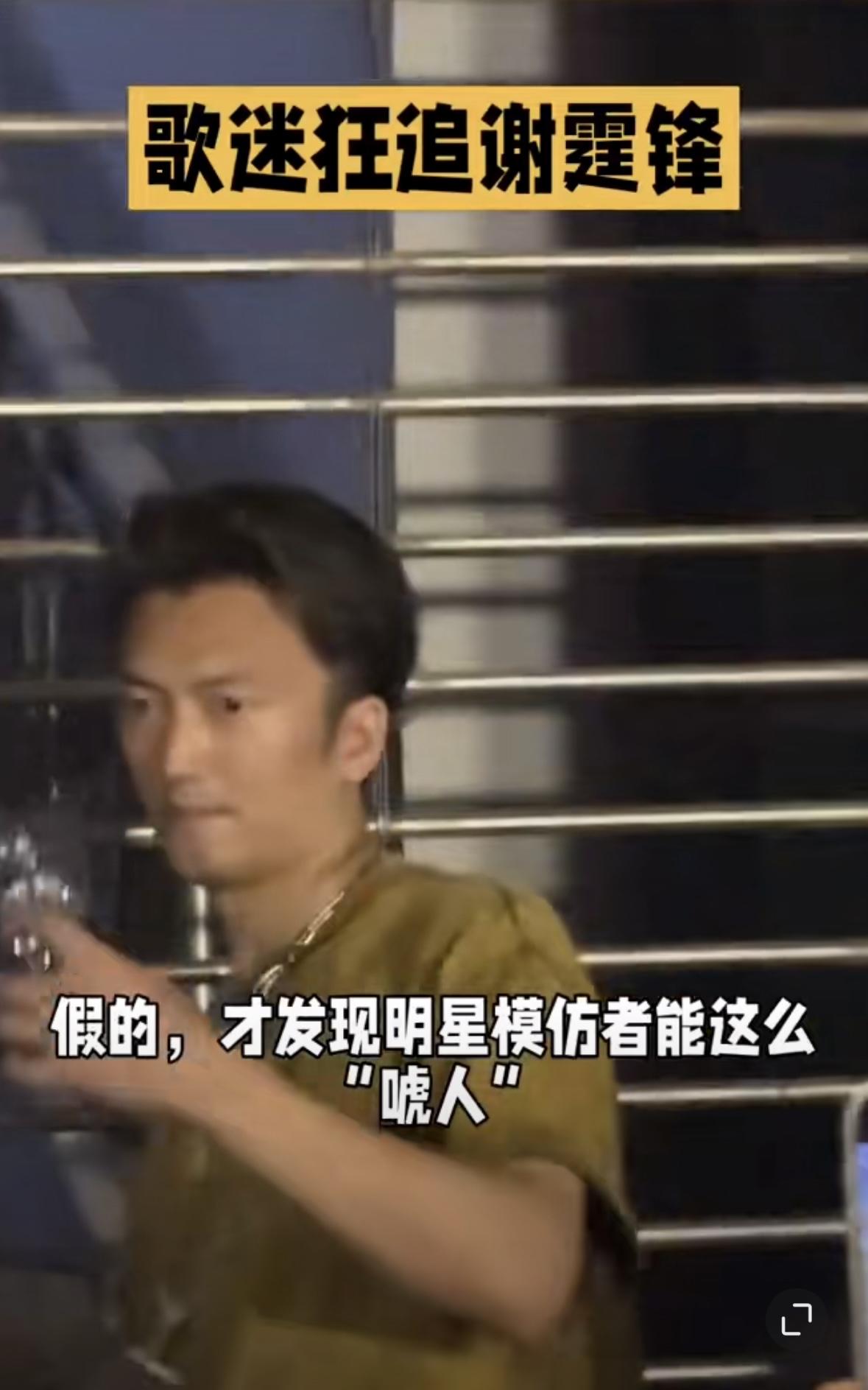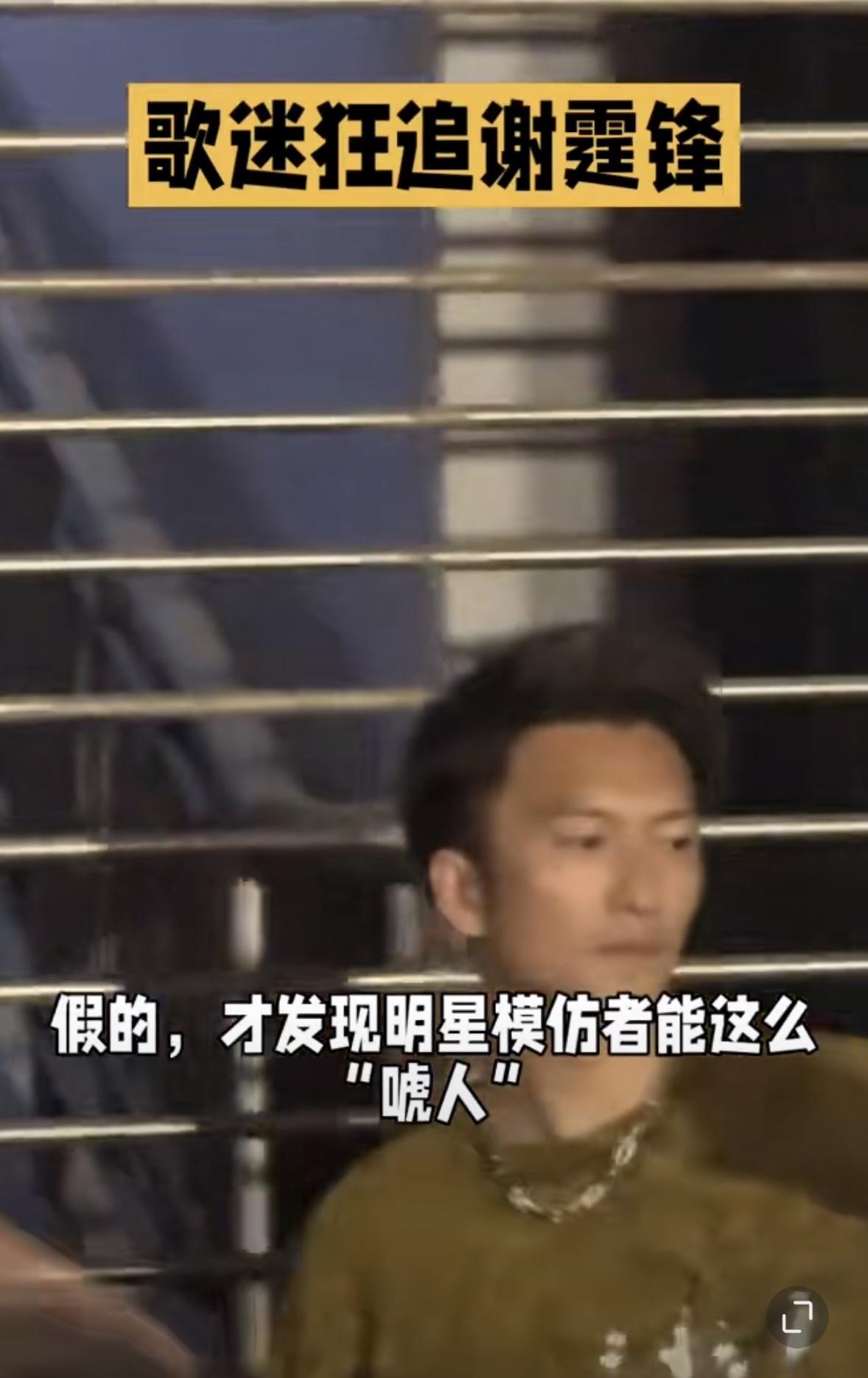 近日在谢霆锋重庆演唱会上,有位酷似谢霆锋的模仿者被歌迷们疯狂围堵拍照拍视频,因为简直太像了,穿着打扮等各方面造型都模仿的很像,不仔细看真的很难辨认出模仿者跟本尊的区别。旁边的保安大哥嗓子都要喊冒烟了,一直说:“假的,散了”试图以此疏散围观拍摄人群,但歌迷们仍热情高举手机追逐拍摄。 感觉大家主打的就是一个玩的心态,无所谓真假,凑凑热闹开心娱乐一下而已😄😄😄谢霆锋 谢霆锋巡演 香港谢霆锋 谢霆锋演唱会