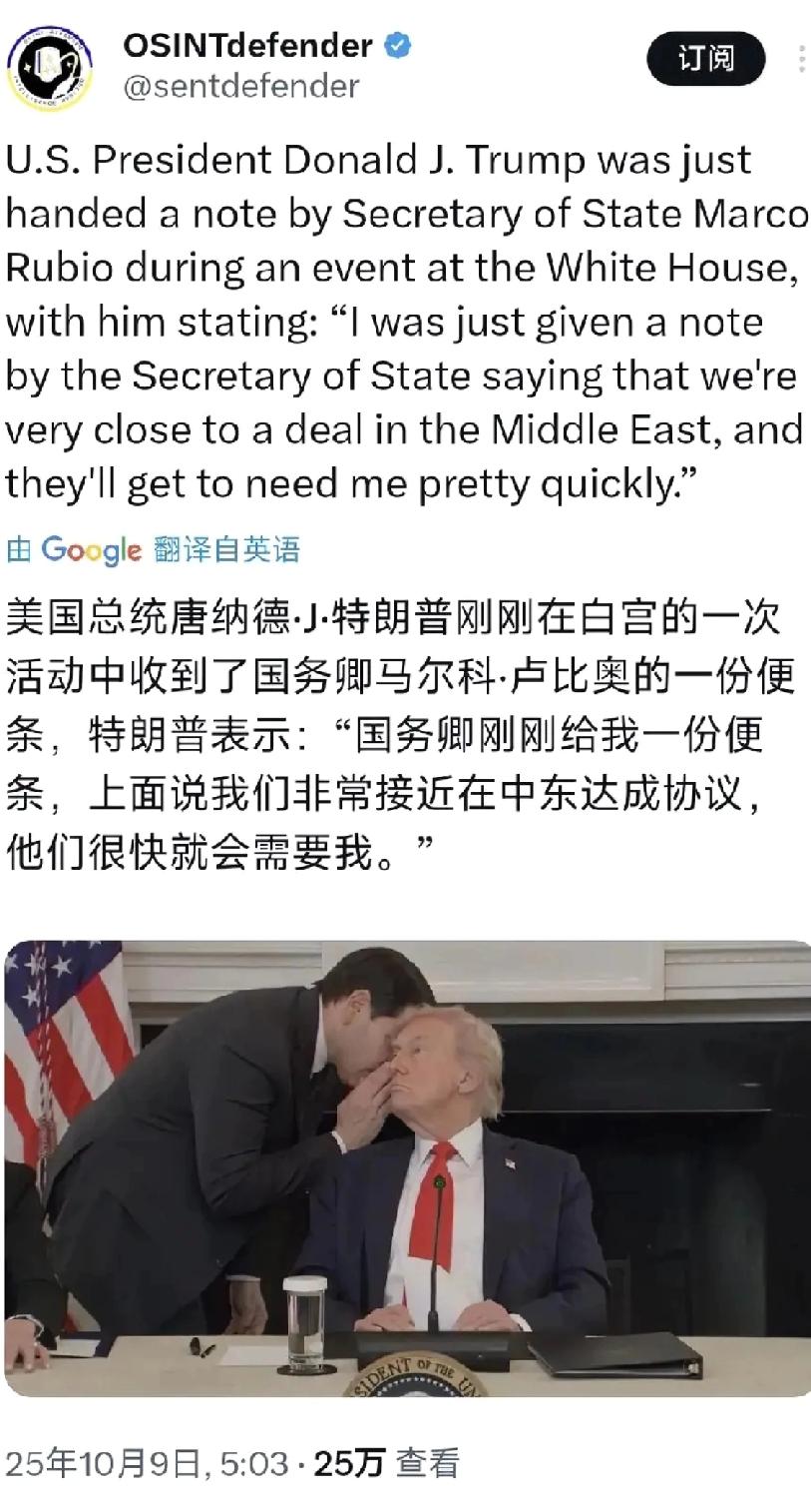 喏!没人比我懂如何搞定哈马斯,一张便条而已,快告诉他们,我需要诺贝尔 不得不说,老特这操作绝对胜过好莱坞。当着媒体的面,安排老鲁进来交头接耳,然后放下一张表条,制造神秘感,然后,当着媒体的面说,喏,你看,这张小便条上说,协议达成了,我很快将飞往中东,主持,见证这一历史性一幕。 潜台词就是:快夸我,夸告诉他们,拿诺贝尔和平没有人比我更适合。