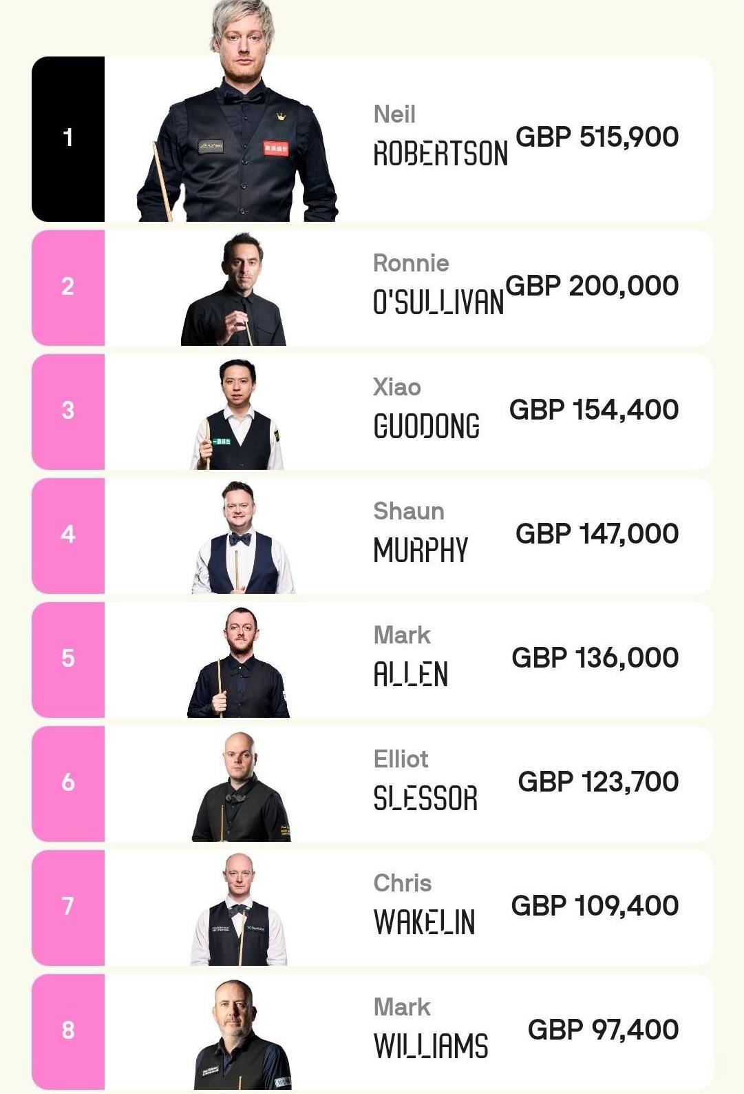 7位中国球员打进西安大奖赛32强,分别是丁俊晖、周跃龙、斯佳辉、吴宜泽、吕昊天、袁思俊和贺国强。综合前几站的成绩,单赛季排名最高的却是最不被大家看好的周跃龙。 周跃龙在英格兰公开赛惜败小钢炮拿到亚军,本次比赛截止目前来看状态又非常好,很有机会再次获得好成绩。 另外其他几人里面,丁主任也恢复了些状态,吴宜泽和斯佳辉虽然打球有点毛糙,但仍然是最有希望走到最后的球员。