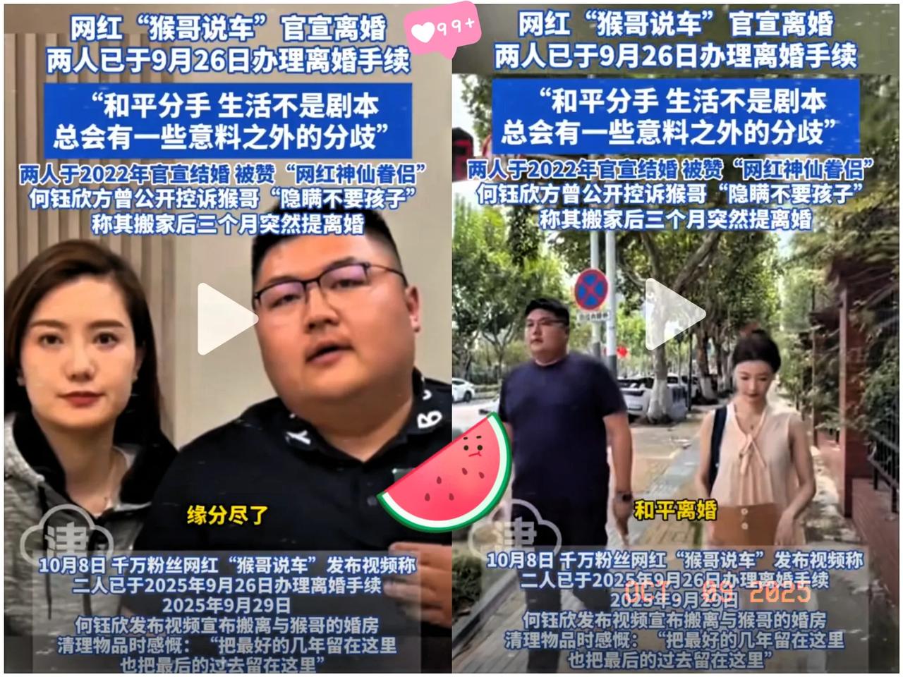 好突然! 他俩承认:离婚, 已办完所有手续。 10月8日,千万粉丝网红“猴哥说车