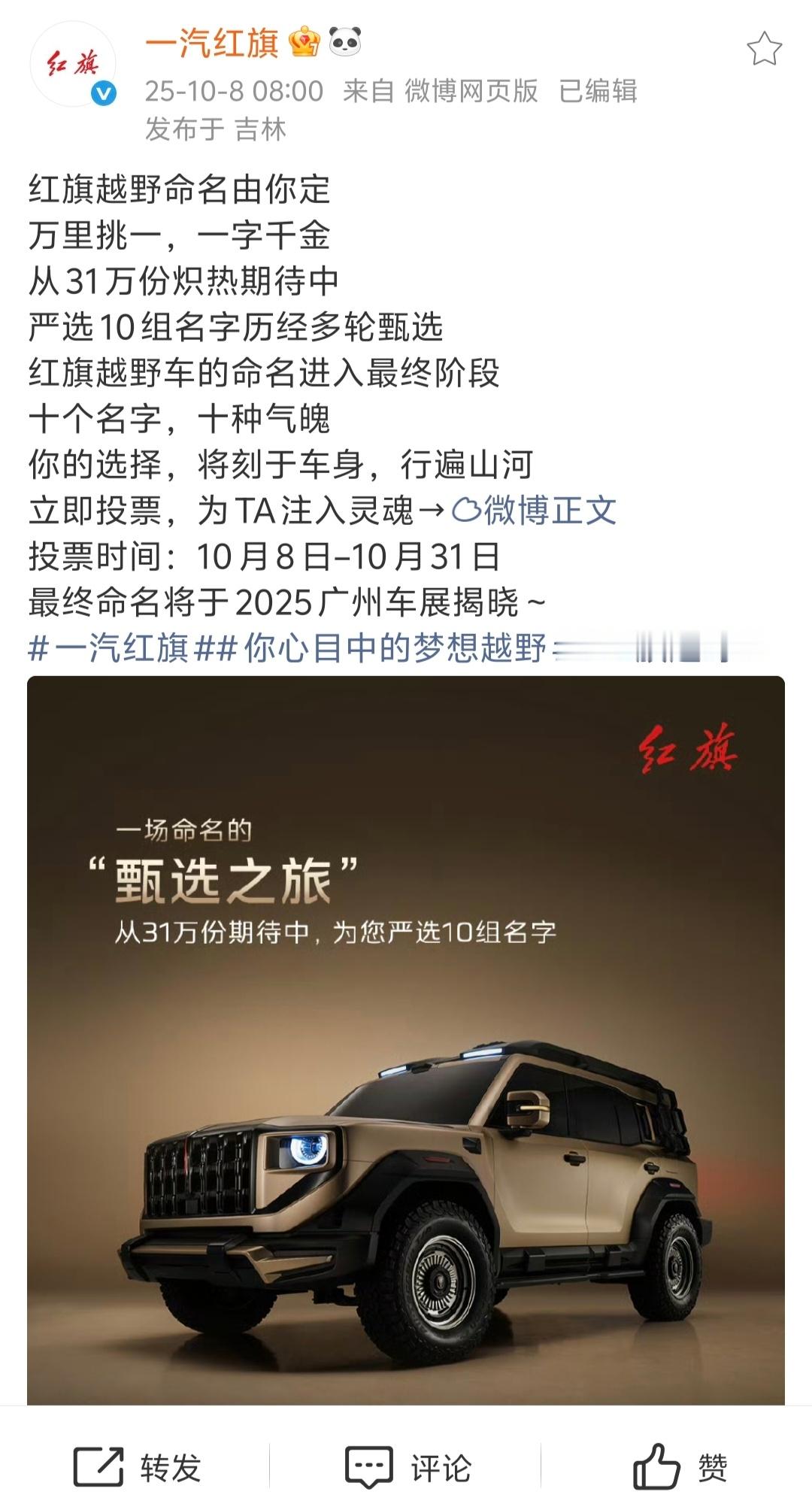 红旗越野车,开始征名!十大备选,赫赫有名~亮剑,井冈山,1927,九州,昆仑,山河,都很赞啊!您觉得哪一个,更红旗?百家车坛