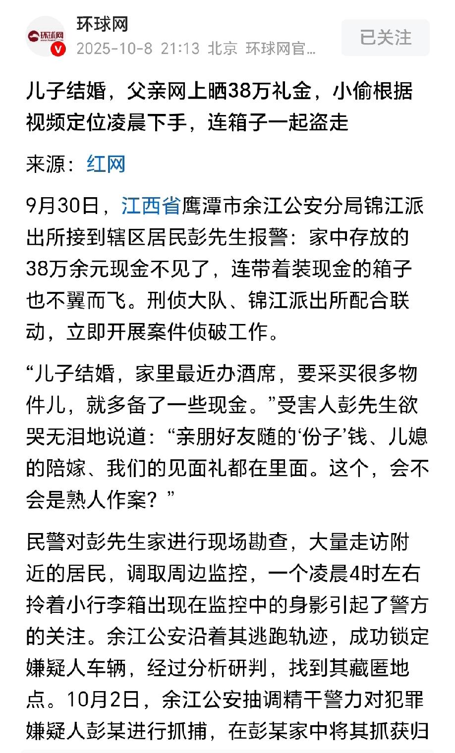 江西鹰潭,男子的儿子办婚礼收到38万礼金,他拍下视频分享这份喜悦,不成想被小偷盯