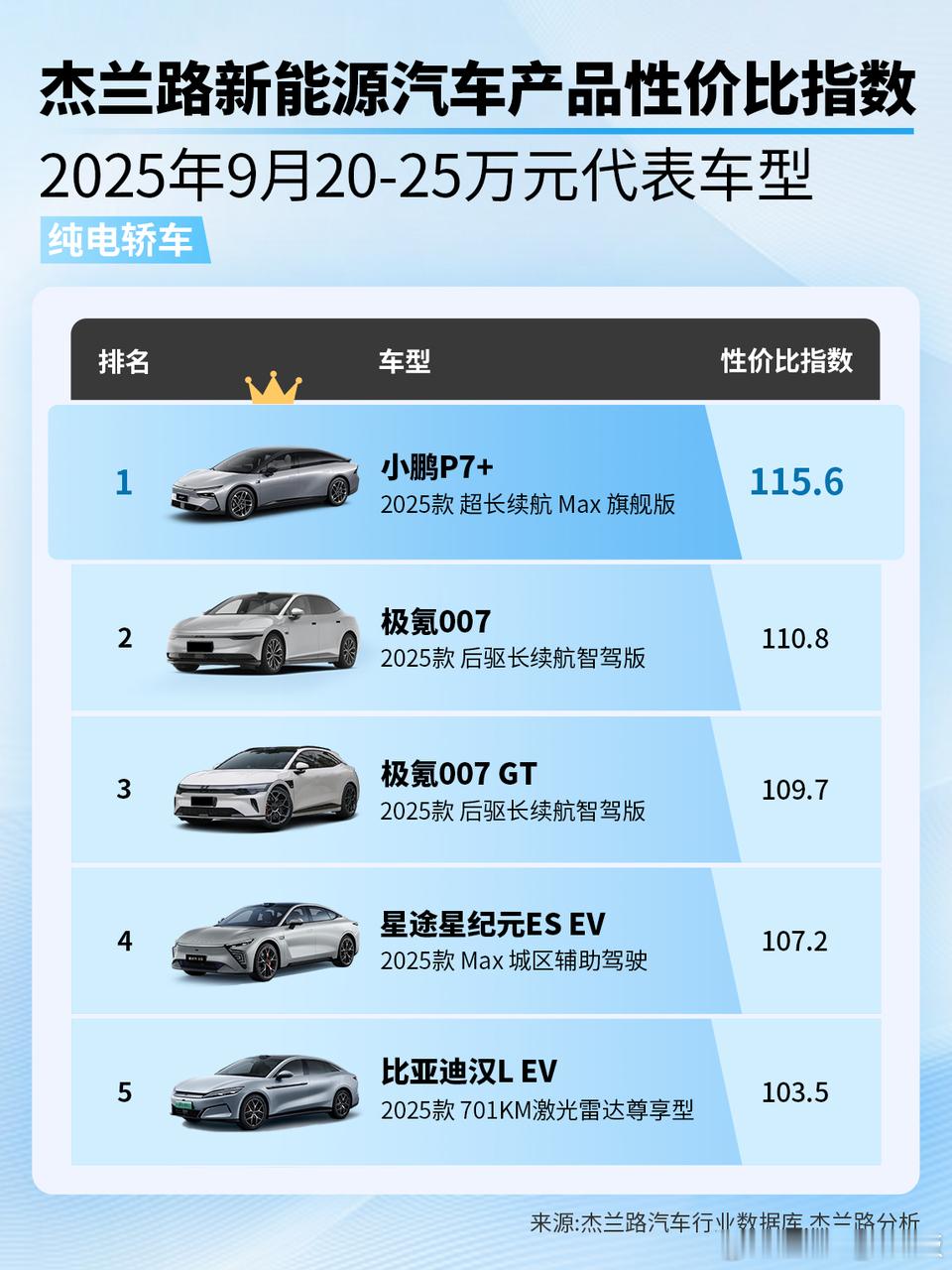 在杰兰路最新发布的新能源汽车性价比指数中,小鹏P7+斩获同级性价比冠军,收获众多年轻家庭用户青睐。