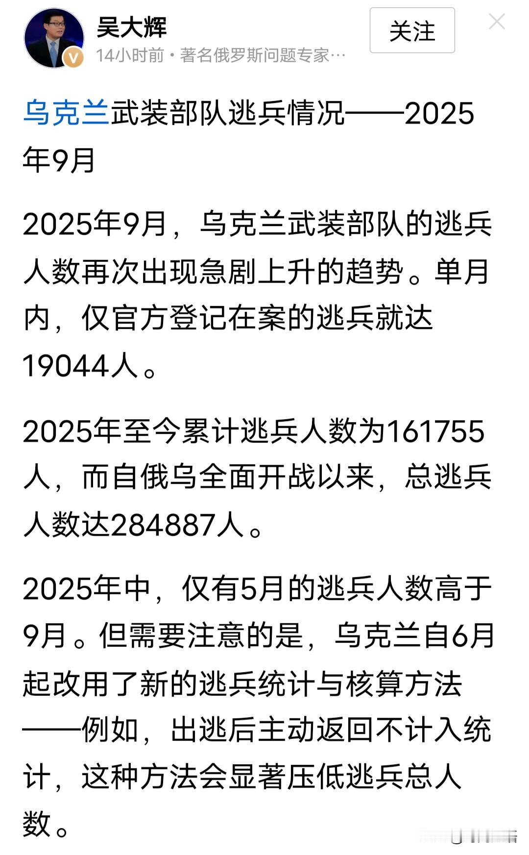 吴大辉被乌克兰骗了,乌军怎么可能有28万多逃兵,大约是把阵亡也统计上可以省去很大一笔抚恤金。 泽连斯基称乌军总人数有88万人,如果有28万逃兵的话这仗还怎么打?所以这里面肯定是有猫腻的。 最有可能的就是把阵亡士兵统计到逃兵里,因为乌克兰打到现在也没钱了。 这种做法虽然省钱但很不好,也不人道,为国捐躯的士兵家属得不到抚恤金还落得逃兵骂名……