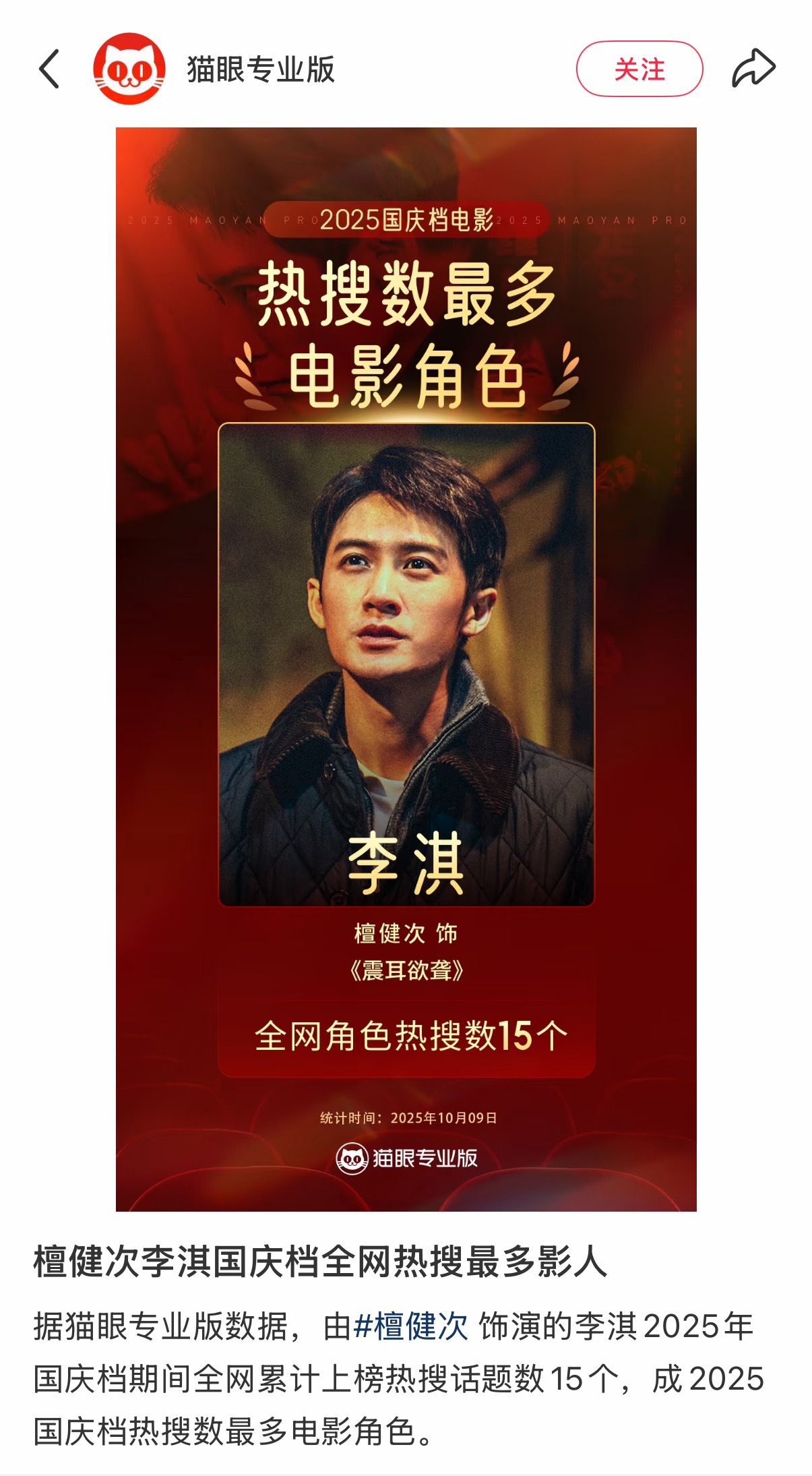 檀健次李淇国庆档全网热搜最多影人,全网累计上榜热搜话题数15个,国庆档热搜数最多电影角色。