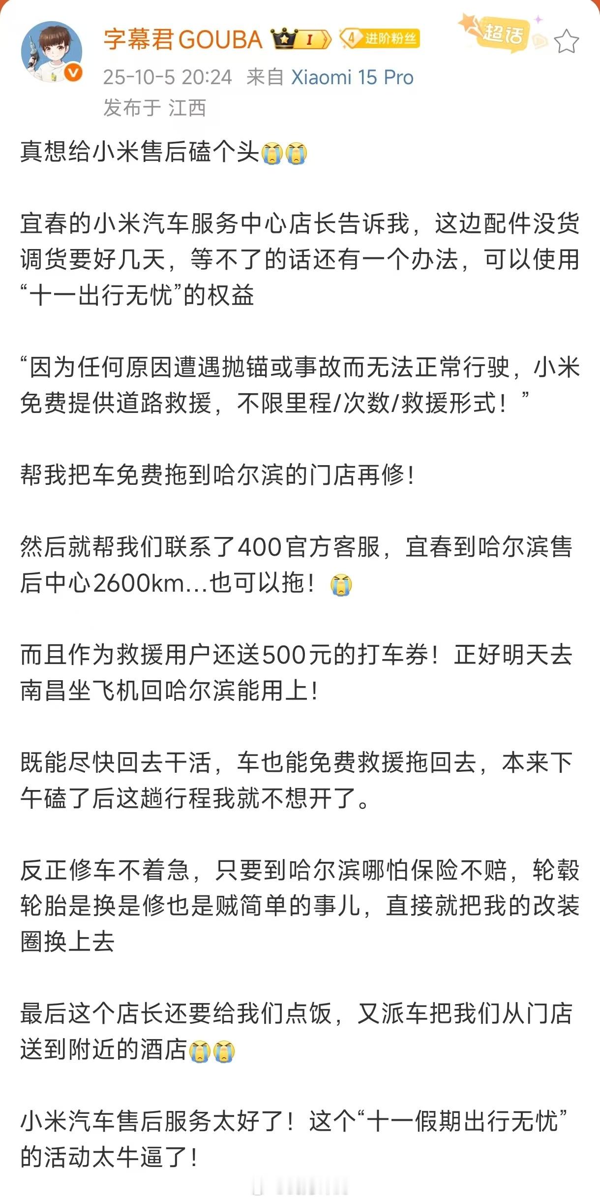 前两天看到的那个博主遇到的问题,那句“因为任何原因遭遇抛锚或事故而无法正常行驶,小米免费提供道路救援,不限里程/次数/救援形式!”