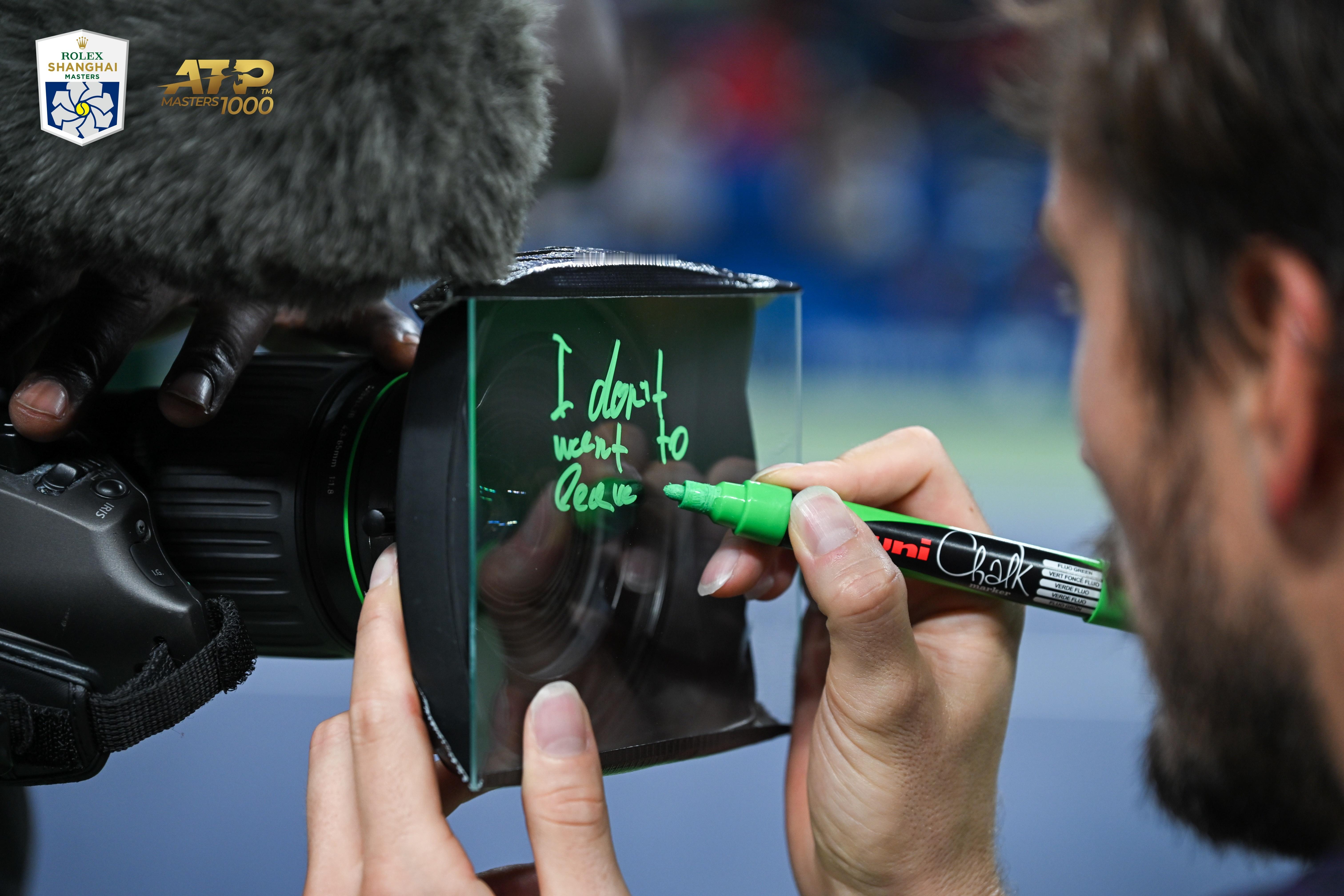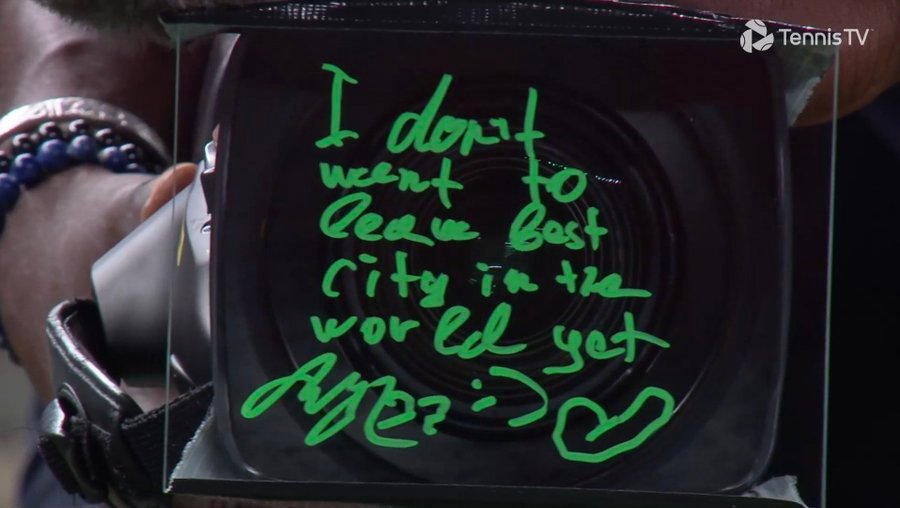 昨夜梅总艰难晋级后,再次签下“我还不想离开全世界最棒的城市”。从没见过谁赛后写下这么长的句子,而且歪歪扭扭的,确实是打抽筋了[笑cry]