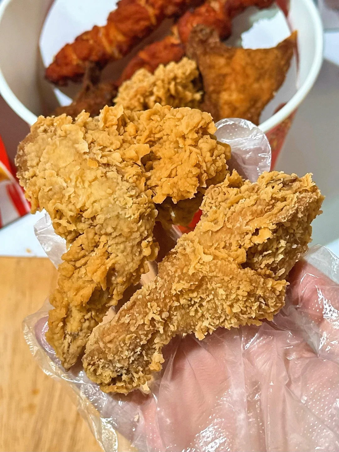 店员端上来满满一大桶金黄酥脆的炸鸡