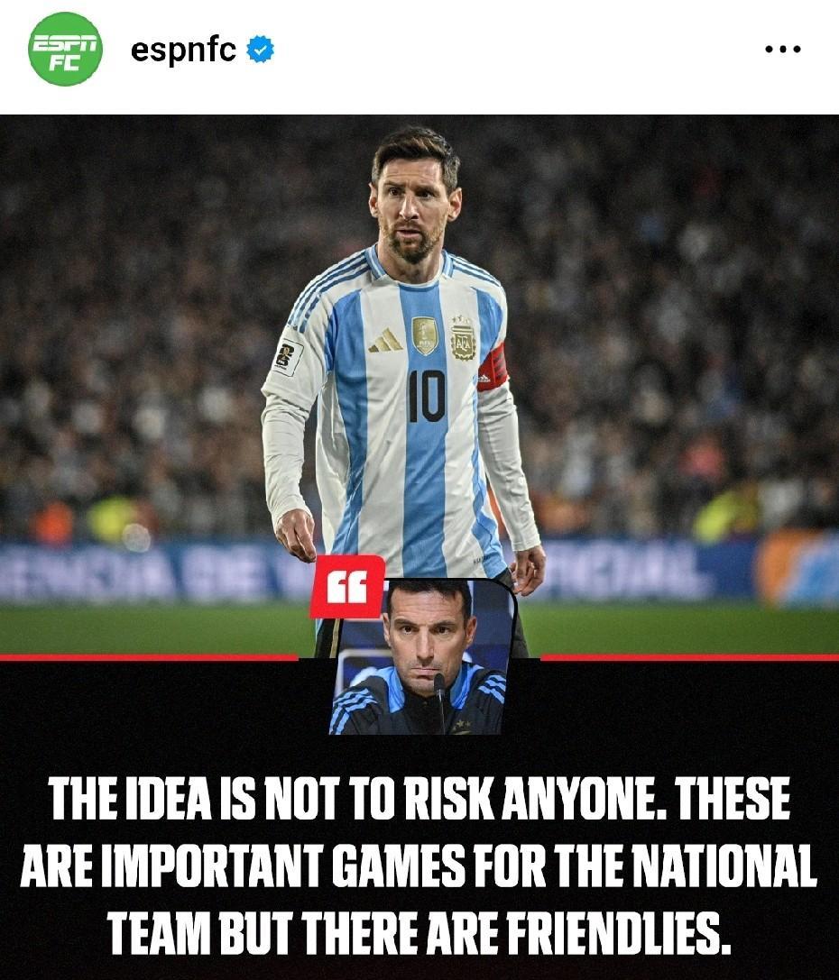 【斯卡洛尼暗示梅西的身体状况可能不适合比赛】这位阿根廷主教练在被问到接下来对阵委内瑞拉和波多黎各的两场友谊赛里梅西上不上场时说:“我不能让任何一个人冒险。国家队比赛尽管重要,但是这毕竟只是友谊赛!”