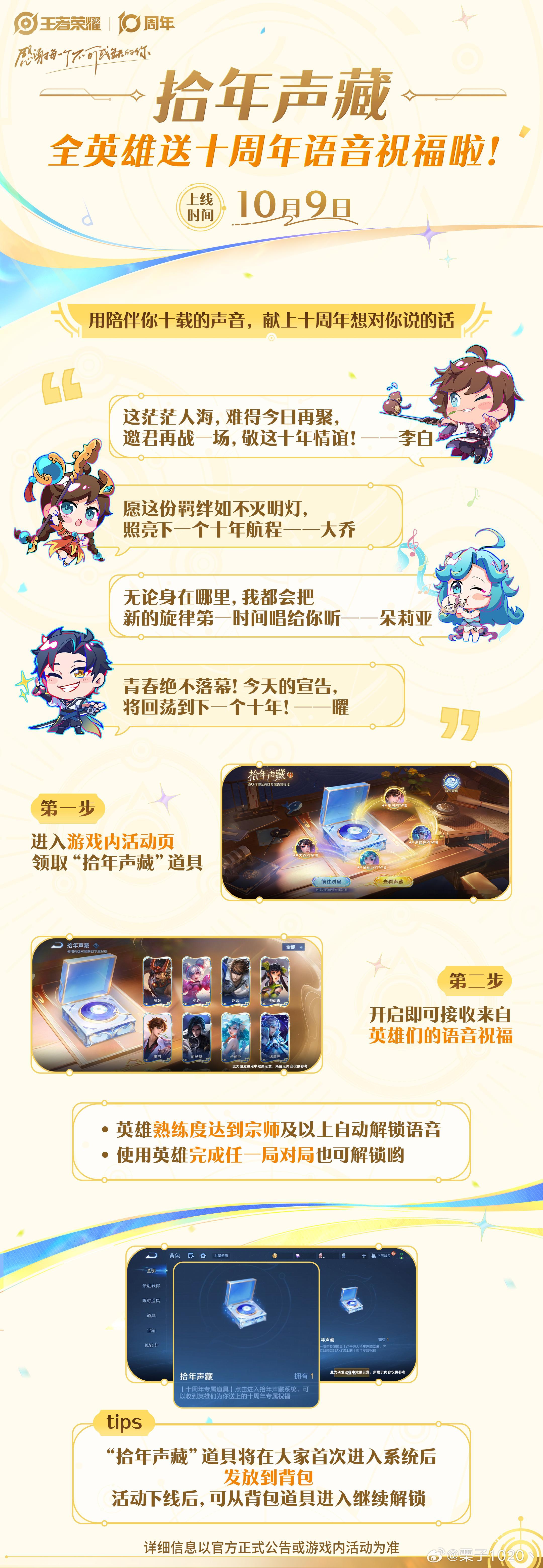 谁的峡谷DNA被这些声音唤醒了!十周年「拾年声藏」活动太懂情怀,打开活动页就被英雄们的祝福包围了。你的本命英雄对你说了什么?快晒出收到的专属祝福,一起留住这份十年羁绊!