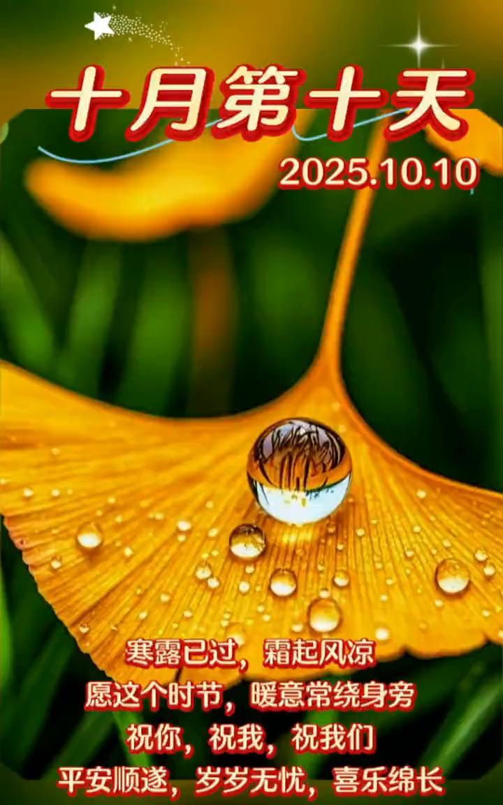 十月第十天。 寒露已过,霜起风凉。愿这个时节,暖意常绕身旁。祝你,祝我,祝我们平安顺遂,岁岁无忧,喜乐绵长。