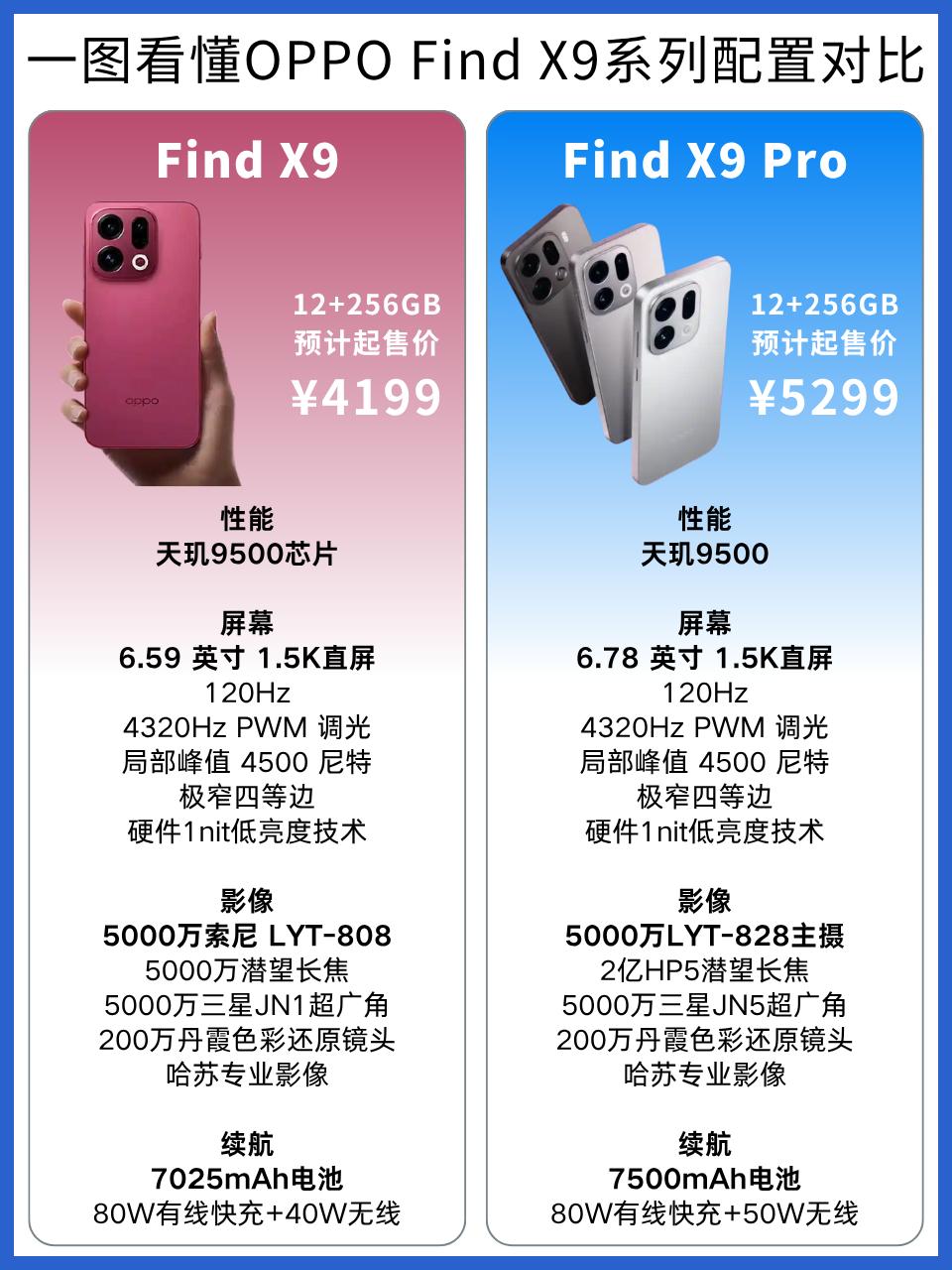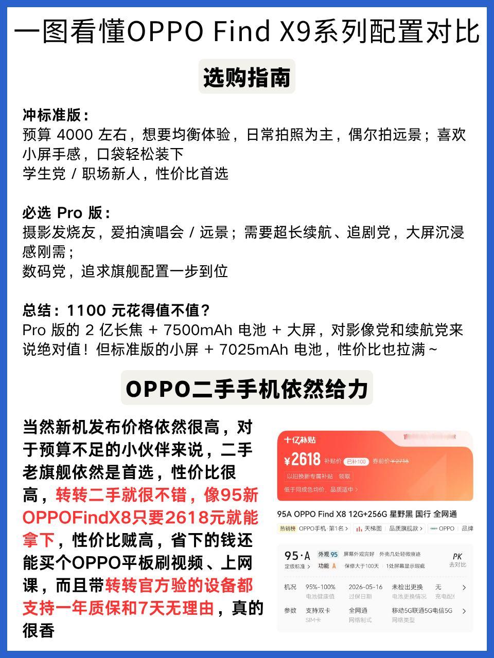 冲标准版: 预算 4000 左右,想要均衡体验,日常拍照为主,偶尔拍远景;喜欢小屏手感,口袋轻松装下 学生党 / 职场新人,性价比首选 必选 Pro 版: 摄影发烧友,爱拍演唱会 / 远景;需要超长续航、追剧党,大屏沉浸感刚需; 数码党,追求旗舰配置一步到位 总结:1100 元花得值不值? Pro 版的 2 亿长焦 + 7500mAh 电池 + 大屏,对影像党和续航党来说绝对值!但标准版的小屏 + 7025mAh 电池,性价比也拉满~oppo OPPOFindX9 oppofindx9pro