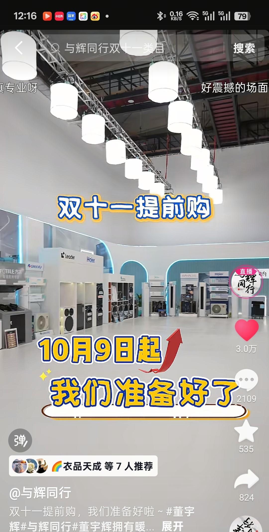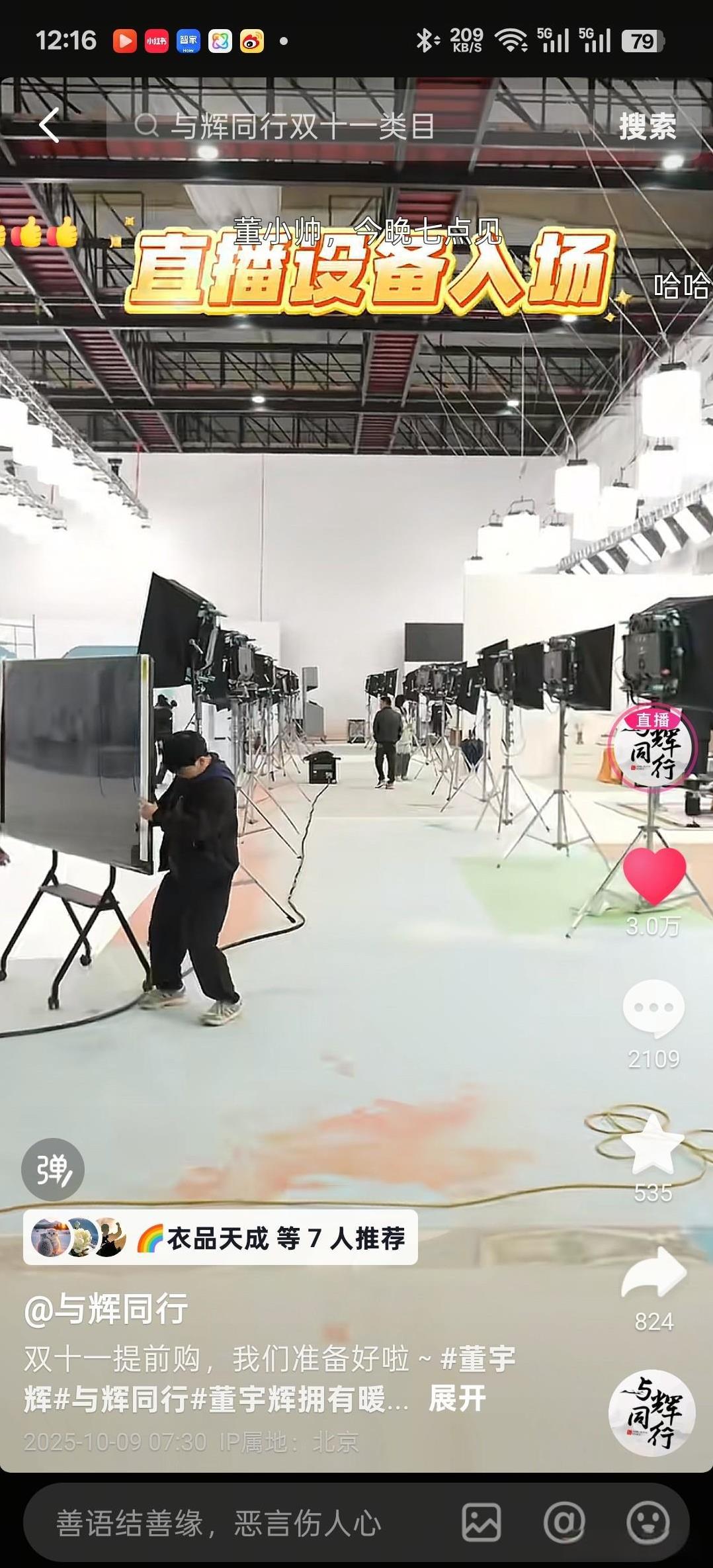 今天10.9号,我们的纪念日,宇辉出圈40个月,与辉同行开播21个月,兰知春序开播3个月的日子,祝董宇辉,与辉同行,兰知春序一路顺利,双十一大卖! 今天是双十一第一天,与辉同行提前租了大场地,整个公司都调动起来,全力以赴。宇辉手还带着伤,也投入了繁忙的备品中。男人,你认真工作的样子好帅! 今天大家电专场,空调,洗衣机,电冰箱,电视机,洗地机等所有品牌的家电都有,国补加平台补贴,优惠多,力度大,大家有需要的去直播间翻翻小黄车。 晚上7点宇辉上播,记住今晚是7点啊7点,重要的事情说三遍,还有定制牛肉7点上架,大家千万不要忘记了,与辉同行和我们已经宣传好几天了,抢不到就是你们自己的责任了,不许甩锅给董小帅! 今晚7点不见不散!