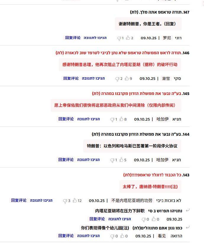 加沙停火协议达成,以色列人盛赞特朗普,同时要把内塔尼亚胡抓去海牙 当地时间10月9日,哈马斯发表声明,证实加沙停火协议达成(第一阶段),除了加沙的难民们一片欢腾,以色列人同样也很“亢奋”,瞬间在网上掀起了一波讨论热潮,而铺天盖地的言论大致可以分为两类:夸特朗普的、骂内塔尼亚胡的。 以色列人直言,特朗普完成的是一项“历史性成就”,所以应该获得诺贝尔和平奖的不是奥巴马而是特朗普。很多人表示特朗普“太棒了”、“是最好的人”,可以说是盛赞了。 不过这场通过政治强压而非对话讨论换来的和平能够持续多久,以色列又值不值得我们相信,这都要打一个问号。但对特朗普来说,他已经“结束了一场战争”,功德无量,以色列要是撕毁协议,那就是下一场战争了(好似在刷kpi)。 相比特朗普收到的“一致好评”,内塔尼亚胡可是被骂的不轻,以色列人这样说道:“这功绩不属于你,别沾沾自喜”、“内塔尼亚胡输给了‘拖鞋’(胡塞武装,这里或许指所有抵抗势力)”、“内塔尼亚胡是最差总理、将会在压力下辞职”。更有人说道:“和平的第二阶段就是把内塔尼亚胡抓去海牙受审,并成立调查委员会查他”。 这想法其实不错,要想让这份来之不易的和平延续得更久,把内塔尼亚胡给赶下台很有必要。根据此前报道,内塔尼亚胡头上有贪污受贿等多项指控,据说坐牢能坐13年,而他此前一直以“战时总理”为由规避法律制裁,现在“和平”了,他还能搬出什么理由呢? 而这一点,也正是外界不看好此次和平的重要原因:内塔尼亚胡为了不去受审坐牢,恐怕只能破坏停火,只有继续当他的“战时总理”,才能延续自己的政治生命。#万能生活指南#