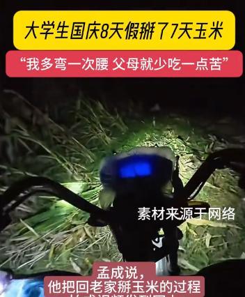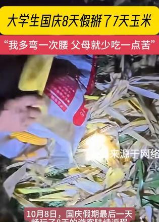 全国人民都知道了!国庆假期最后一天,畅玩了8天的游客陆续返程,然而当天上午,青岛农业大学的大一学生孟成,还在山东老家的田里掰玉米,国庆8天假掰了7天半玉米,他表示自己多弯一次腰父母就少吃一点苦”,网友:为山东爷们点赞! 10月8日的清晨,全国不少高速路口已经排起返程的长队,行李箱滚轮划过地面的声响。 孩子对假期的回味声交织在一起,多数人都在忙着结束假期、回归日常。 但在山东潍坊诸城市石桥子镇大店子村,一片被雨水泡得发黏的玉米地里。 20岁的孟成正攥着玉米棒往下掰,黄色的玉米须粘在他沾泥的手背上,裤脚卷到膝盖。 还是免不了被泥水溅湿,额头上的汗顺着脸颊往下淌,一擦就是一道泥印。 就在这样一个大家忙着整理行囊、清点旅途照片的日子里,孟成还在跟时间“抢”玉米。 9月30号晚上坐末班车回的家,10月1号天刚亮就下地了。 他后来跟记者聊起时,语气里没什么波澜,仿佛这只是假期里最平常的安排。 可只有他自己知道,第一天钻进玉米地时,玉米叶划过胳膊的刺痛感有多明显,到后来胳膊上结了薄茧,才慢慢习惯。 也只有他清楚,每天弯腰上百次后,晚上躺在床上腰有多酸,但一想到爸妈不用再这么累,就觉得值。 孟成的爸妈都过了50岁,平时在镇上摆水果摊讨生活,国庆正是水果生意最火的时候。 秋天的苹果、橘子刚上市,来往的游客多,一天下来根本抽不开身。 更让人着急的是,今年秋收前连着下了好几天雨,地里的泥土湿得能攥成团。 重型收割机一进去就陷在泥里,别说收玉米了,机器能不能开出来都成问题。 每天清晨,他揣着两个馒头就往地里走,中午啃口馒头、喝瓶矿泉水,接着干到太阳落山。 爸爸收摊后,会开着小货车到地里,把孟成一天掰下来的玉米一袋袋搬上车,拉回家晾晒。 孟成的同学陈浩宇,跟他是一个镇的发小,小学到中学都在一块上学。 国庆期间,陈浩宇也帮家里收了3天玉米,听说孟成一个人扛着5亩地的活儿,特意抽了10月7号下午和8号上午来帮忙。 两个年轻人在泥地里穿梭,衣服上、鞋子上全是厚厚的泥巴,说话间都带着喘,但没人喊累。 陈浩宇表示,孟成能把8天假期几乎全耗在地里,这份踏实劲儿让他佩服,他都这么拼了,我来搭把手是应该的。 孟成把自己收玉米的片段拍成了短视频,发在了抖音上。 视频里没有华丽的配乐,也没有刻意的台词,只有他弯腰掰玉米的背影、沾满泥巴的双手,还有一句随口说的“我多弯一次腰,父母就少吃一点苦”。 评论区里,有人说“这才是当代大学生该有的样子,不是躺平刷手机,而是帮父母扛事”。 也有人感慨“为山东爷们点赞!孝顺从来不是嘴上说说,是真能弯腰干活”。 还有不少网友分享自己的经历,说自己假期也帮家里收庄稼了,原来像孟成这样的年轻人还有很多。 吉林有位张同学国庆期间开着拖拉机帮家里收了5天苞谷,济南也有年轻人特意开车百公里回农村老家,跟着家人一起抢收庄稼。 其实孟成的情况并不是个例,学校里不少农村来的学生,假期都会回家帮家里干农活。 “这是很平常的事,只是孟成的视频让更多人看到了而已。” 在山东农村,平均每户有3到8亩地,七成以上的秋收还得靠人工,不是不想用机器,是实在条件不允许。 小地块面积小,加上雨水多的时候地太湿,机器一进去就陷住,修一次机器的钱比收一季玉米还贵,小农户根本负担不起。 有人问孟成,学的是计算机专业,天天跟代码打交道,回家掰玉米会不会觉得“掉价”? 他却摇头说,我是农村孩子,我的根在农村,这没什么丢人的。 在他看来,学代码和掰玉米不冲突,前者是为了未来,后者是为了家人,都是该做的事。 比起有些地方刻意设计的“感恩教育”,孟成在玉米地里的每一次弯腰,才是最真实的孝道。 信息来源:山东卫视2025-10-09发布视频