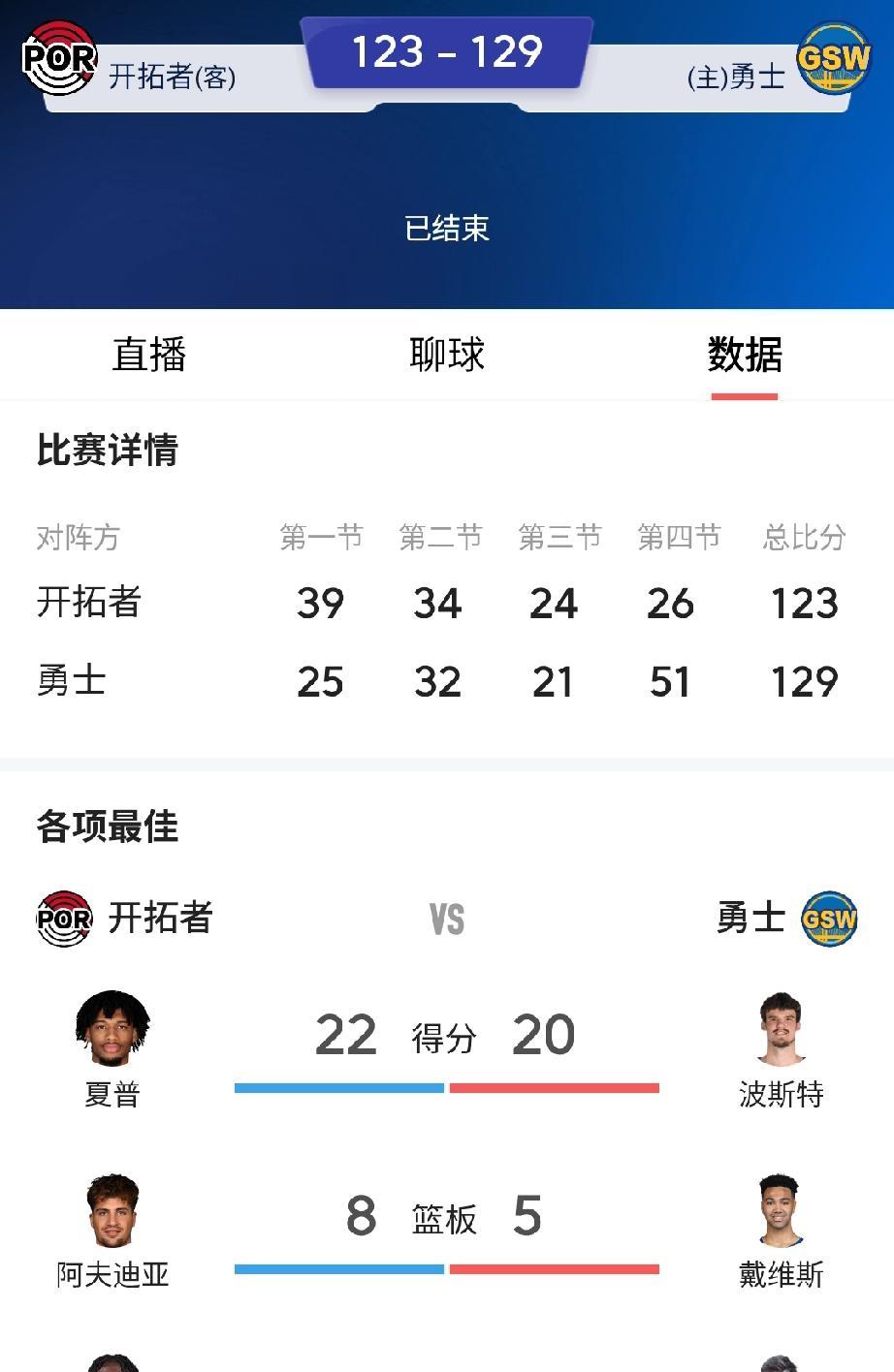 杨瀚森暴露致命缺陷季前赛开拓者123-129惨遭勇士大逆转,末节勇士打出51-