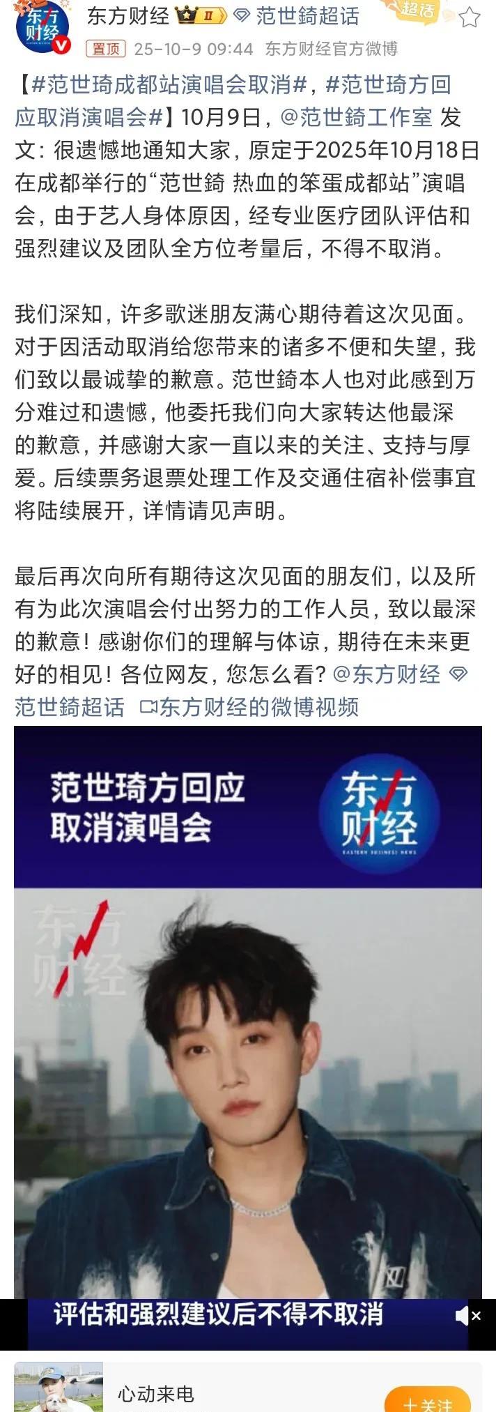 突发,范世琦成都演唱会宣布取消! 10月9日上午,范世琦工作室突然发布通告,宣布取消范世琦成都站演唱会,原因是范世琦身体不适,经过专业医疗团队评估后确定短期内不适合举办演唱会。 然后网友们发表了各种评论,然而其中有一部分态度并不友好: 好搞笑,还想开演唱会,呵呵,不要! 你只是身体不好,你的“好朋友”呢? 太好了,太好了,以后别出来了! 最好是真的身体不舒服,为了买你票的五十多个粉丝要振作啊。 是不是因为票剩太多了? 身体不好?前几天不是挺蹦跶的吗? 建议直接退圈! 就这么多人,包间去唱就行了。 最近一直有一群人抵制范世琦,这种心情我能理解,毕竟出发点是善意的,但并不支持,因为范世琦但凡有那么大背景,就不至于出道多年一直不温不火了,而且传闻并没有任何有效的证据支撑,在此提醒善良的大家,不要被人当成工具,整件事很可能是被人故意拿来当挡箭牌的,在缺乏证据的前提下,不要网暴无辜艺人,这种行为不但暴露双商,而且涉嫌违法!