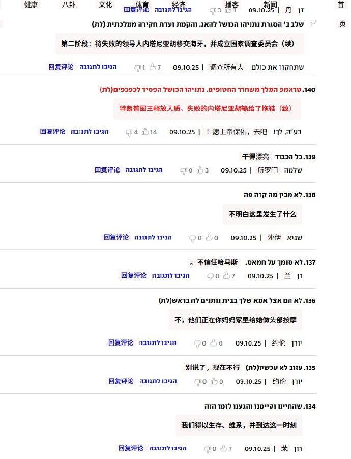 加沙停火协议达成,以色列人盛赞特朗普,同时要把内塔尼亚胡抓去海牙 当地时间10月9日,哈马斯发表声明,证实加沙停火协议达成(第一阶段),除了加沙的难民们一片欢腾,以色列人同样也很“亢奋”,瞬间在网上掀起了一波讨论热潮,而铺天盖地的言论大致可以分为两类:夸特朗普的、骂内塔尼亚胡的。 以色列人直言,特朗普完成的是一项“历史性成就”,所以应该获得诺贝尔和平奖的不是奥巴马而是特朗普。很多人表示特朗普“太棒了”、“是最好的人”,可以说是盛赞了。 不过这场通过政治强压而非对话讨论换来的和平能够持续多久,以色列又值不值得我们相信,这都要打一个问号。但对特朗普来说,他已经“结束了一场战争”,功德无量,以色列要是撕毁协议,那就是下一场战争了(好似在刷kpi)。 相比特朗普收到的“一致好评”,内塔尼亚胡可是被骂的不轻,以色列人这样说道:“这功绩不属于你,别沾沾自喜”、“内塔尼亚胡输给了‘拖鞋’(胡塞武装,这里或许指所有抵抗势力)”、“内塔尼亚胡是最差总理、将会在压力下辞职”。更有人说道:“和平的第二阶段就是把内塔尼亚胡抓去海牙受审,并成立调查委员会查他”。 这想法其实不错,要想让这份来之不易的和平延续得更久,把内塔尼亚胡给赶下台很有必要。根据此前报道,内塔尼亚胡头上有贪污受贿等多项指控,据说坐牢能坐13年,而他此前一直以“战时总理”为由规避法律制裁,现在“和平”了,他还能搬出什么理由呢? 而这一点,也正是外界不看好此次和平的重要原因:内塔尼亚胡为了不去受审坐牢,恐怕只能破坏停火,只有继续当他的“战时总理”,才能延续自己的政治生命。