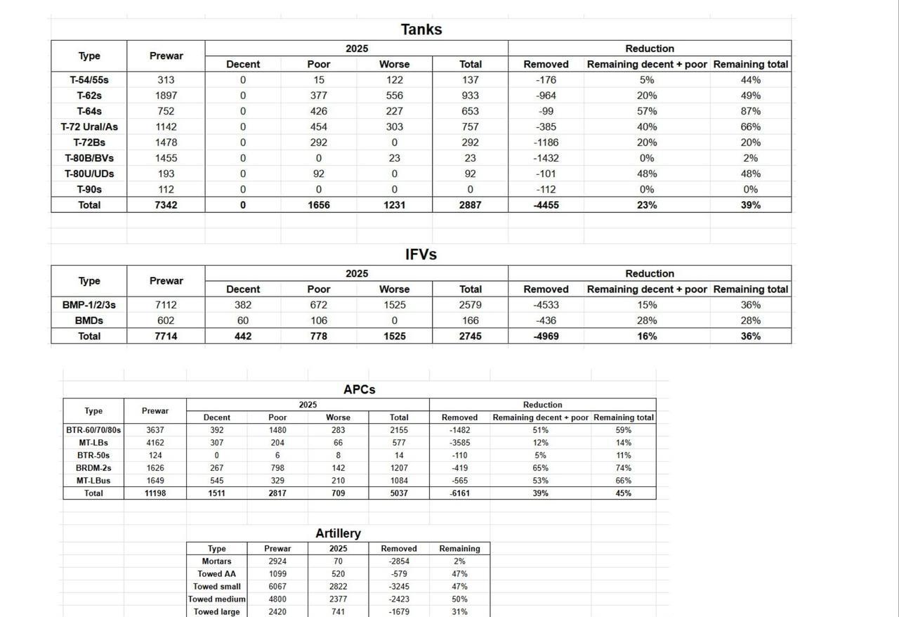 俄军4400辆坦克消失,俄罗斯高估了苏联遗产 10月8日消息,开源情报显示,俄罗斯自2022年俄乌冲突爆发以来,已从其战前的7300辆坦克库存中调出超过4400辆,目前仅剩不到2900辆在库。现存坦克中只有约23%处于可用或良好状态,大量老旧型号如T62、T55乃至T54正被重新焊接上阵。 不仅坦克,俄军的BMP步兵战车、装甲运输车、BMD空降战车和各类火炮系统也均出现50%以上的削减,步兵战车从7100辆锐减至2579辆,装甲车从11000多辆降至约5000辆。 这份数据表明,俄罗斯高估了苏联遗产。而且不仅高估了苏联遗产的数量,更高估了它的质量和可持续性。 大量封存的坦克在苏联解体后长期缺乏维护,有些甚至只是堆在露天的锈壳子,根本无法开机即用。 开战头一年还能靠库存车迅速填补前线,如今却只能翻修报废品,甚至用文物上战场。 而在现代战争中,坦克不再是突进的主角,而是无人机、炮兵和制导弹药的固定靶子。 更雪上加霜的是,俄罗斯本身的工业体系早已无法比肩苏联时代,每年坦克新产能不过二三百辆。 而且修一个能打的T62,可能要拆两辆报废的T80当零件,还要冒着火控失灵和乘员安全的风险。 可以说,如今俄军的装甲力量已进入榨干阶段。T80系列已经彻底从储备中抽空,T62和T55的翻修正在耗尽最后的技术可能性。 事实证明,苏联的确留下了庞大军备,但绝不是一场21世纪现代战争的解药。
