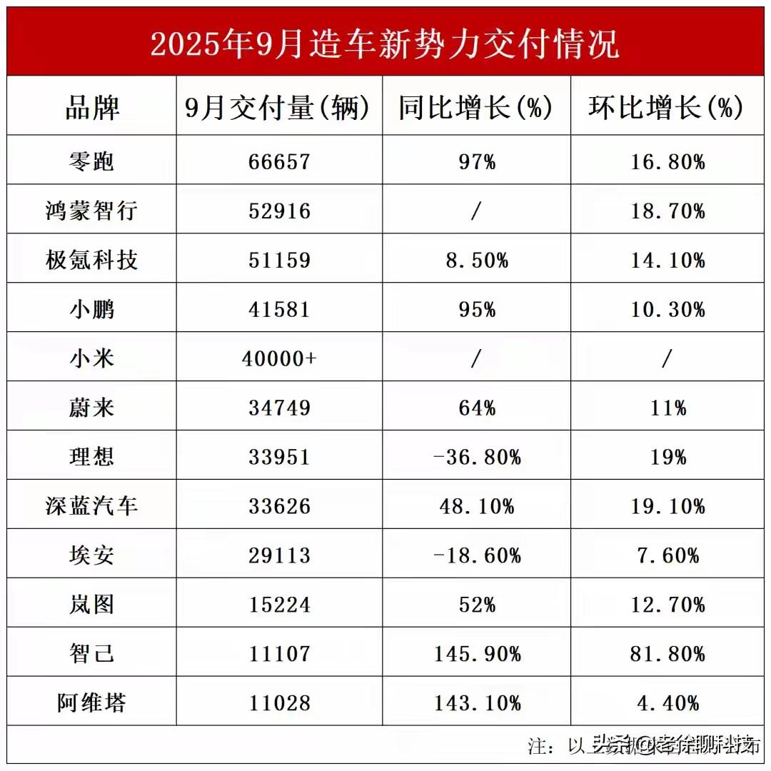 9月新势力销量榜大变天,黑马竟是它?汽车江湖风起云涌,月销4万竟只是入场券。 零跑汽车9月狂卖66,657辆,首次突破6万辆大关,连续7个月稳坐新势力销量冠军宝座。同比增长超过97%的亮眼数据,让零跑成为今年最大的黑马。 新势力阵营迎来大洗牌,头部玩家的门槛已升至“月销4万+”的全新量级。 小鹏汽车以41,581辆的成绩稳居前列,小米汽车也首次突破4万辆大关,两家企业双双创下历史交付新高。 曾经的领跑者理想汽车,如今以33,951辆的交付量排在蔚来之后,同比下滑36.8%。 金九银十的销售旺季让多家品牌创下纪录:极狐、岚图、智己等品牌也交出了历史最佳成绩单。新能源汽车市场的竞争从未如此激烈,而这场大战的赢家,最终还是消费者。