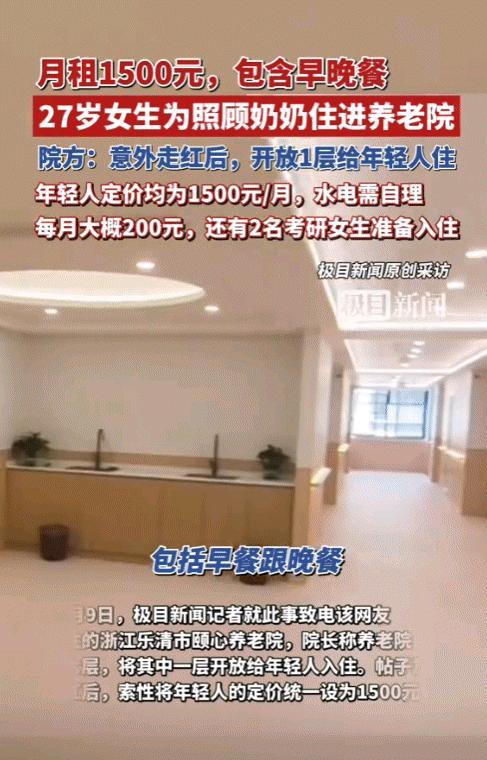 “提前养老?”浙江,27岁女生为照顾奶奶住进养老院,月租1500,关键是还包含早晚餐,意外走红后,有两位准备考研的女孩已交钱准备入住。网友:青年养老院这个赛道未来绝对能赚钱! 据极目新闻10月9日报道,奶奶年纪大了,一个人住家里,儿孙总是不放心,送去养老院吧,又怕老人心里不乐意,觉得是被“抛弃”了。 就在家里人左右为难的时候,奶奶自己打了个电话给孙女,提出了一个让所有人都没想到的主意:“要不,你陪我一起住养老院吧?” 这个提议听着有点奇怪,但仔细一想,还真挺有道理,奶奶看中的这家颐心养老院,刚开业不久,设施都挺新,关键是离孙女上班的地方特别近。 姑娘平时工作忙,如果住在这里,早上出门前能过来看看奶奶,帮着收拾一下,晚上下班后又能直接过来陪老人说说话,比两头跑方便太多了。 养老院那边一听这情况,也觉得是个不错的想法,因为是新开的,空房间还有不少,他们给出了一个相当优惠的方案:奶奶的月费是2600块,姑娘作为陪伴家属入住,每个月只需要交1500块钱的“租金”。 这1500块,不仅包了住宿,还管早晚两顿饭,姑娘一盘算,这可太划算了,在乐清这样的地方,1500块可能连个像样的单间都租不到,现在不仅有了住处,连吃饭问题都解决了大半。 最重要的是,能天天陪着奶奶,让她安心,自己也踏实,就这么着,姑娘在奶奶的隔壁房间安顿了下来。 白天她是写字楼里的上班族,晚上就回到养老院,陪着奶奶在院子里散散步,聊聊一天遇到的趣事,对她来说,工作和亲情得到了最好的平衡。 再也不用每天掐着点打电话问候,也不用一到周末就急匆匆地赶回家,生怕老人一个人出什么状况,这种随时能见面的陪伴,是任何物质都换不来的。 当然,住进养老院也得遵守这儿的规矩,比如,晚上八点大门就关了,对于习惯了夜生活的年轻人来说,这可能有点不适应。 姑娘偶尔加班晚了,就得给保安打电话,让人家给开个门,但她觉得这些都是小事,跟能陪在奶奶身边相比,早点回家休息也没什么不好。 她说,养老院的饭菜虽然清淡,但营养均衡,吃着也放心,省了自己天天点外卖的烦恼,这事传到网上后,一下子就炸开了锅,评论区里说什么的都有。 一位网友留言说:“这姑娘真是个孝顺孩子!现在多少年轻人为了工作把老人扔家里,她能想出这种办法,既不耽误自己,又能照顾老人,太难得了,这比花钱请保姆强多了,亲人的陪伴才是最好的。” 还有不少人开始算经济账:“1500块还包两顿饭?水电费一个月也就200来块,这性价比也太高了!我一个月房租加吃饭怎么也得三四千,这姑娘一下子省了一大半,简直是给年轻人指了条明路啊。” 当然,也有人提出了担忧:“年轻人和老年人作息习惯完全不一样,年轻人晚上看看手机、听听歌,会不会吵到需要安静休息的老人?这事儿听着好,但实际操作起来会不会有矛盾?” 没想到,这些担忧不但没有劝退大家,反而激发了更多年轻人的兴趣,养老院的咨询电话都快被打爆了,很多年轻人都来打听,能不能也用这个价格住进来。 养老院的赵院长一看这情况,干脆顺水推舟,做出了一个大胆的决定:专门腾出一整层楼,开放给有需求的年轻人,月租统一就是1500块,包早晚餐,还提供打扫卫生的服务。 不过,院长也提出了要求,不是谁想来都能来的,申请入住的年轻人必须有稳定的工作,性格要好,最重要的是得尊重老人的生活习惯,不能在院里大声喧哗,影响老人休息。 这个消息一放出来,立刻就有了响应,除了那位照顾奶奶的姑娘,又有两个准备考研的女孩交了定金,准备搬进来。 她们说,考研需要一个绝对安静的环境,养老院正好满足了这个条件,而且这里还管饭,她们就能把所有精力都投入到学习中,不用再为生活琐事分心。 这件事看似是一个个例,但背后却反映出当下社会很多年轻人和老年人共同的困境,年轻人面临着高昂的房租和生活压力,而许多独居老人则忍受着孤独和寂寞。 养老院将这两者结合起来,让年轻人用较低的成本解决了居住问题,同时又用他们的朝气和活力,给养老院带来了新的生机,让老人们不再孤单,这可以说是一个“三赢”的局面。 这种“代际共居”的模式,不仅仅是提供一个住的地方那么简单,它更像是一种情感的连接,年轻人可以从老人那里学到人生的智慧,而老人也能从年轻人身上感受到时代的脉搏。 这种互相陪伴、互相温暖的模式,或许为我们未来的养老和居住问题,提供了一个充满人情味的新思路。 大家怎么看这种年轻人住进养老院的模式?如果你的城市也有这样的机会,你会考虑吗?来评论区聊聊你的想法吧。 信源:极目新闻2025-10-9——月租1500元,包含早晚餐!27岁女生为照顾奶奶住进养老院,院方:意外走红后,开放一层给年轻人住,定价均为1500元/月,水电需自理