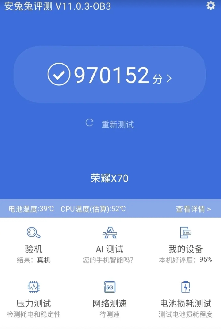 都说荣耀X70,处理器用6gen4辣鸡,跑分低,今天下载了一个安兔特地测试了一下,跑分竟然有97万分,对于一个千元机来说,可以了吧! 另外它还有8300毫安电池,两天一充也没事,外加满级防水,红外➕NFC,再配上荣耀独有的绿洲护眼屏,妥妥的神机啊! 怪不得销量榜上,能排国产机第一,看来是买对了! 平常也会打打联盟,吃鸡,也是没有压力的。 不过比起那些游戏机还是有所不足的。
