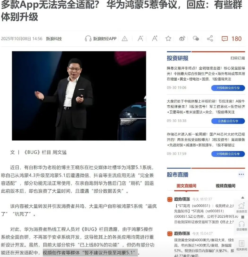 华为这波热搜上的有点莫名其妙,很早之前已经回应过一次了,还能被炒上去就很离谱。 不过即便如此,华为也敢于大胆承认,一是一二是二。目前鸿蒙5系统是全面自研,很多软件都要重新开发适配,部分软件开发适配功能不全,这就坦然承认了。并且华为主动劝退视频创作者,告诫不要升级鸿蒙5.1。 这波回应大气尽显,比起躲在后面的群体,敞亮多了。 鸿蒙的阵痛期远远没有过去,但黎明早晚会到来!