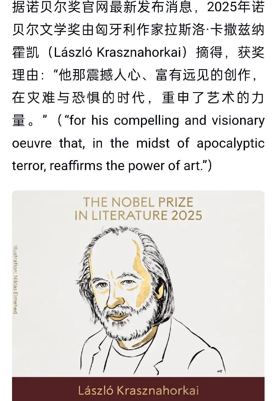 震撼!71岁的匈牙利作家拉斯洛·卡撒兹纳霍凯获得了2025年诺贝尔文学奖,其核心