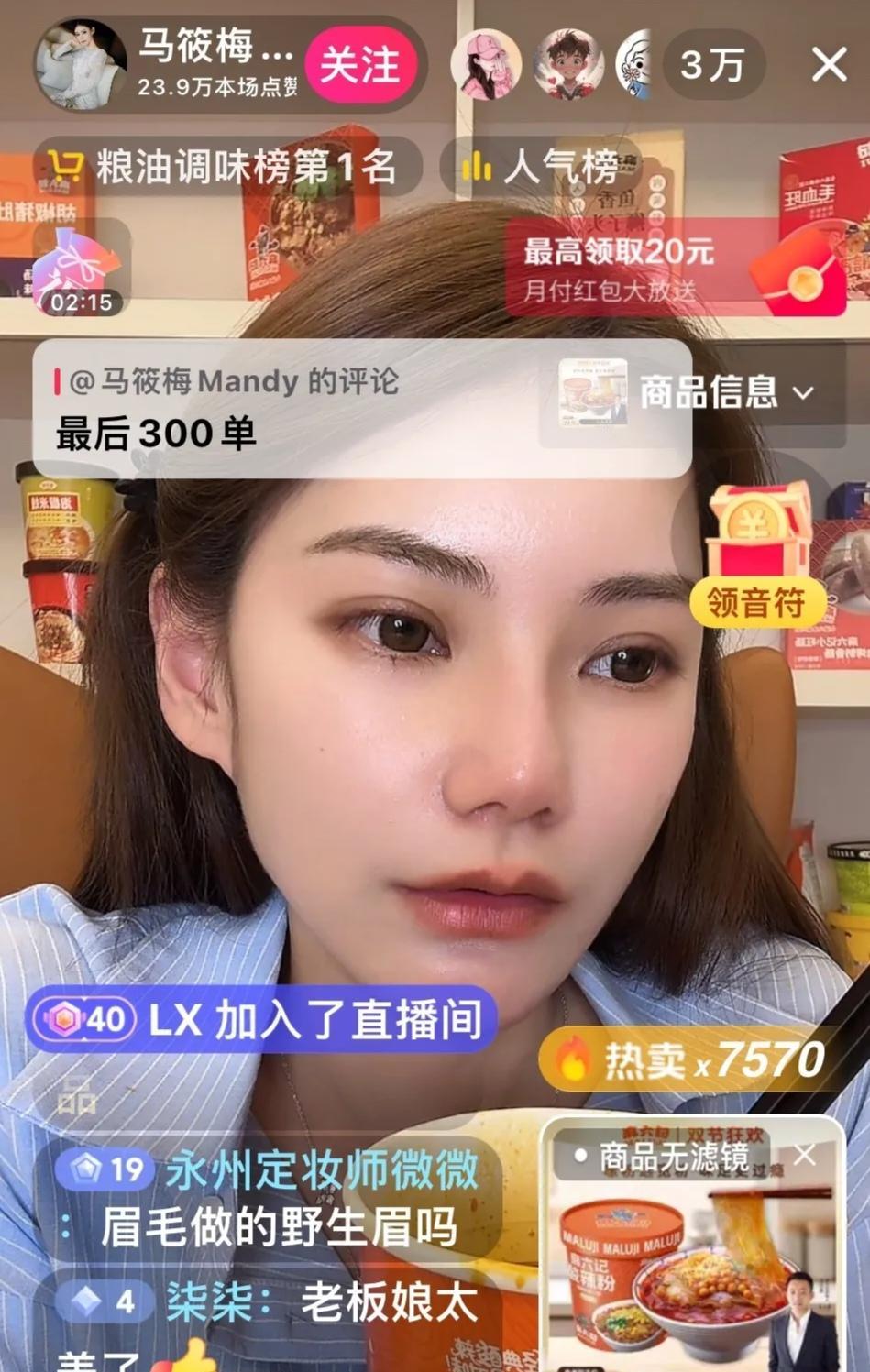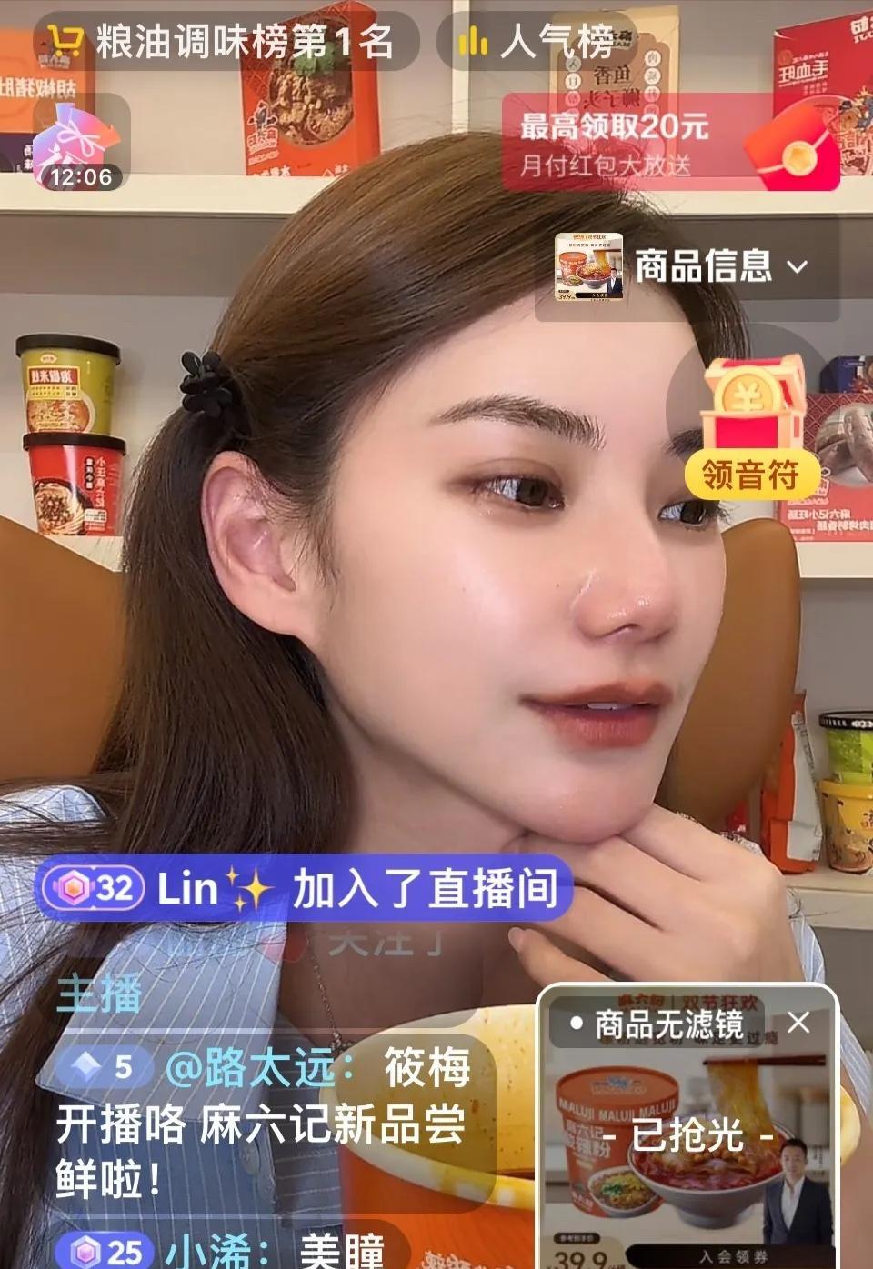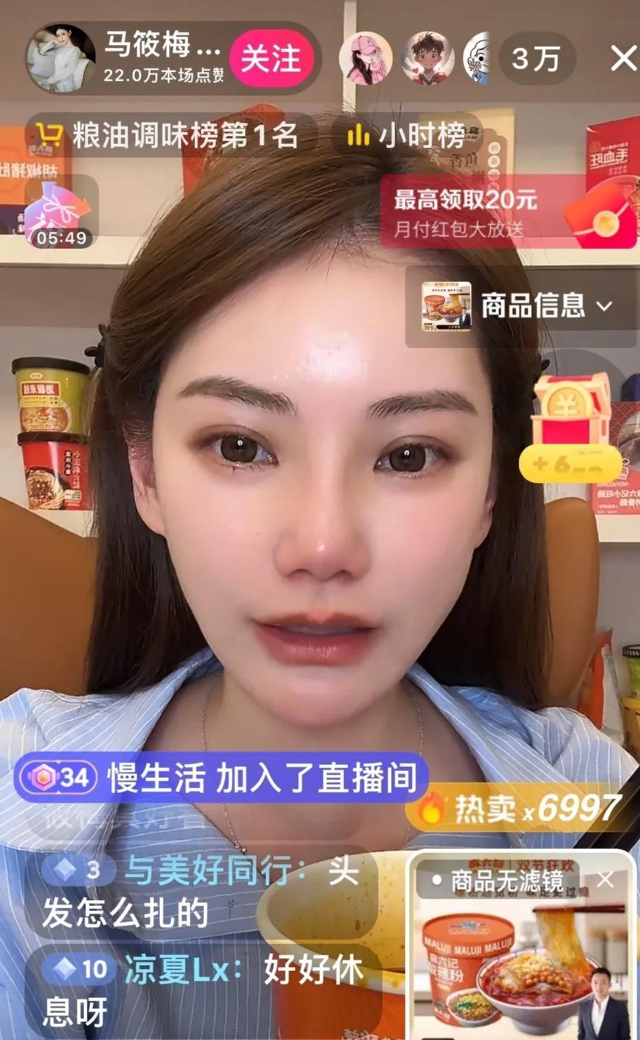 小梅特别旺夫啊,她直播的特点就是温温柔柔、慢条斯理的介绍麻六记的产品。她边吃着酸