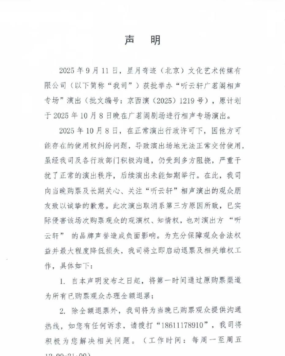 #相声界恩怨情仇# 曹云金公司,就广茗阁纠纷,发布声明:道歉、退票、维权。 昨天晚上,曹云金的演出团队,和广茗阁剧场方,发生了一些纠纷,导致当天晚上的正常演出,未能如期进行。 就在刚刚,抖音账号“曹云金工作室”和“听云轩剧场”,都发布了一则声明,解释了纠纷产生的原因,并阐述了解决办法,以及公司维权的相关事宜。 曹云金公司首先向购票的观众、关注听云轩的朋友们致以诚挚的道歉。 公司还公布了一个沟通热线,当晚购票的观众除了可以退票之外,还可以打热线电话提出诉求。 最后,就是维权。 我觉得曹云金公司发布这则声明,非常及时,也非常真诚,因为多方的阻挠,导致演出无法进行,我相信购票的观众朋友也是能够理解。 下一步,曹云金和听云轩,将会如何维权,让我们拭目以待吧。