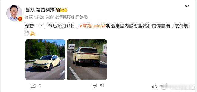 懂车之道讯懂车之道快讯,从零跑汽车高级副总裁曹力社交平台上获悉,零跑Lafa5