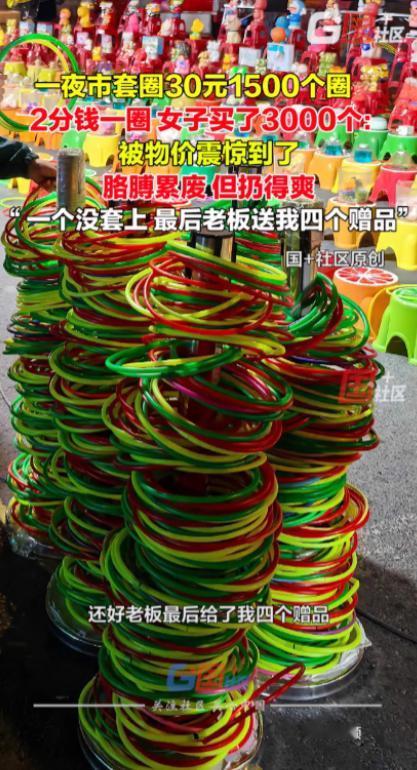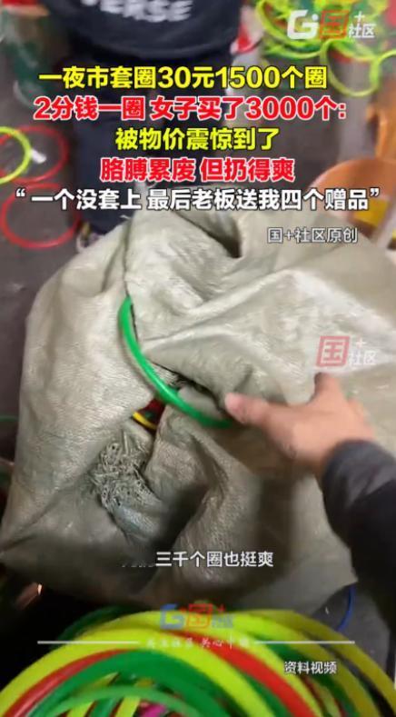 3000千个圈3秒丢一个,1分钟20个,十分钟200个,需要150分钟不停的丢完,这不累死个人。而且摊主起码得准备几万个圈吧!要是同时有几个人丢,一下就得准备万把个,边丢边捡的话,老板也得累死人。三十块也是难挣😂