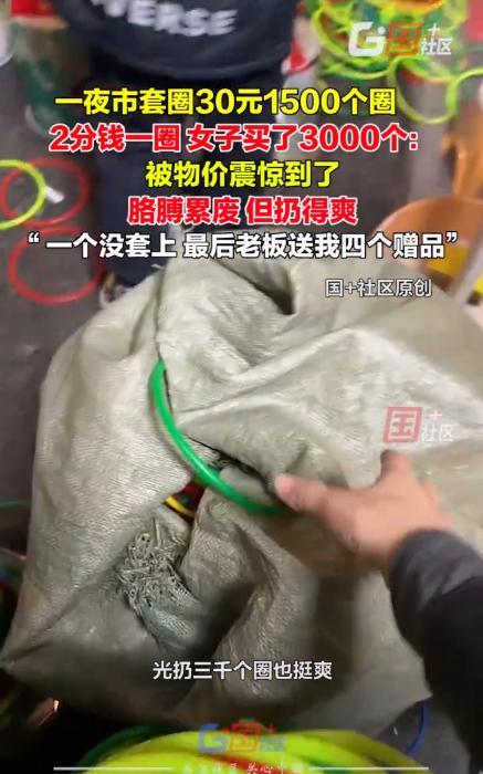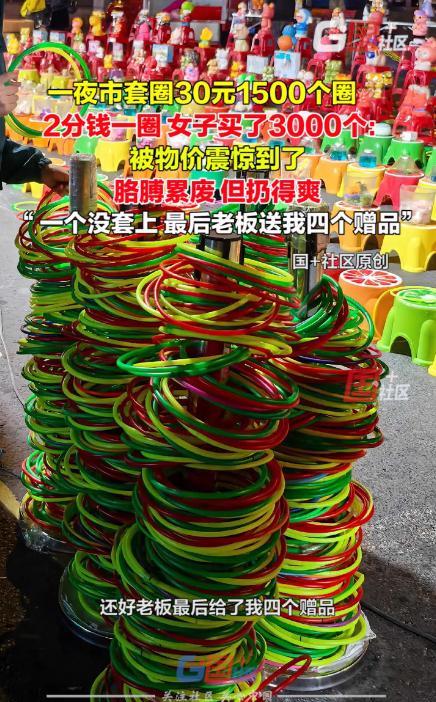 “这就是东北的物价吗?”黑龙江齐齐哈尔,一女子假期来旅游,逛夜市时,突然看到有套圈的地摊,地上密密麻麻全都是圈,上前一问才知道,30元1500个,于是大手一挥,直接买了3000个圈, 可即便如此,她都没有套到东西,就连老板都看不下去了 马女士介绍,当天逛夜市时,看到地上密密麻麻铺满了藤圈,像秋天落叶似的堆叠着。摊主见她好奇,抬头说了价格:三十块钱一千五百个圈 这价格让她愣了一下。在别处旅游时,十块钱买二十个圈都算便宜,这里给的量简直像批发。她心想,就算闭着眼睛乱扔,总该能中几个吧,于是就买了3000个圈,可当两个沉甸甸的编织袋提到她脚边时,她才意识到问题所在。这三千个圈,得扔到什么时候? 起初她还认真瞄准,蹲下身找角度,后来发现手臂开始发酸,干脆站直了随手抛。圈像雨点般落下,撞在玩具车上弹开,擦着陶瓷存钱罐边缘滚远,在毛绒玩具堆里打转就是不肯停住。路过的人纷纷驻足,看着这个被圈包围的女子,奖品却一个都没套中 扔到后来胳膊都抬不起来了,最后准备离开时,摊主却突然叫住了她,往她怀里塞了四个小礼品,或许这真是看不下去了 有网友说:这只能说明套中率多低,是设计的问题,礼物放在那么窄的地方上,套上也掉下来了 说实话,夜市的套圈摊,摆的都是心理战。你看着奖品多、圈多,觉得概率肯定不低,可那距离、圈的弹性、物品大小,样样都是讲究。你要真想靠运气赢,几乎没戏。摊主卖的不是圈,是娱乐的氛围和那点希望 所以说,这类游戏也没必要太认真。夜市的乐趣不在输赢,而在那股烟火气。能笑着掏钱玩两下、被坑点也能乐呵,那就值了,更何况这个价格,真说不上亏 真要套奖品,不如直接买个回家,还省得累出一身汗。能笑着走开的,才是玩明白的人