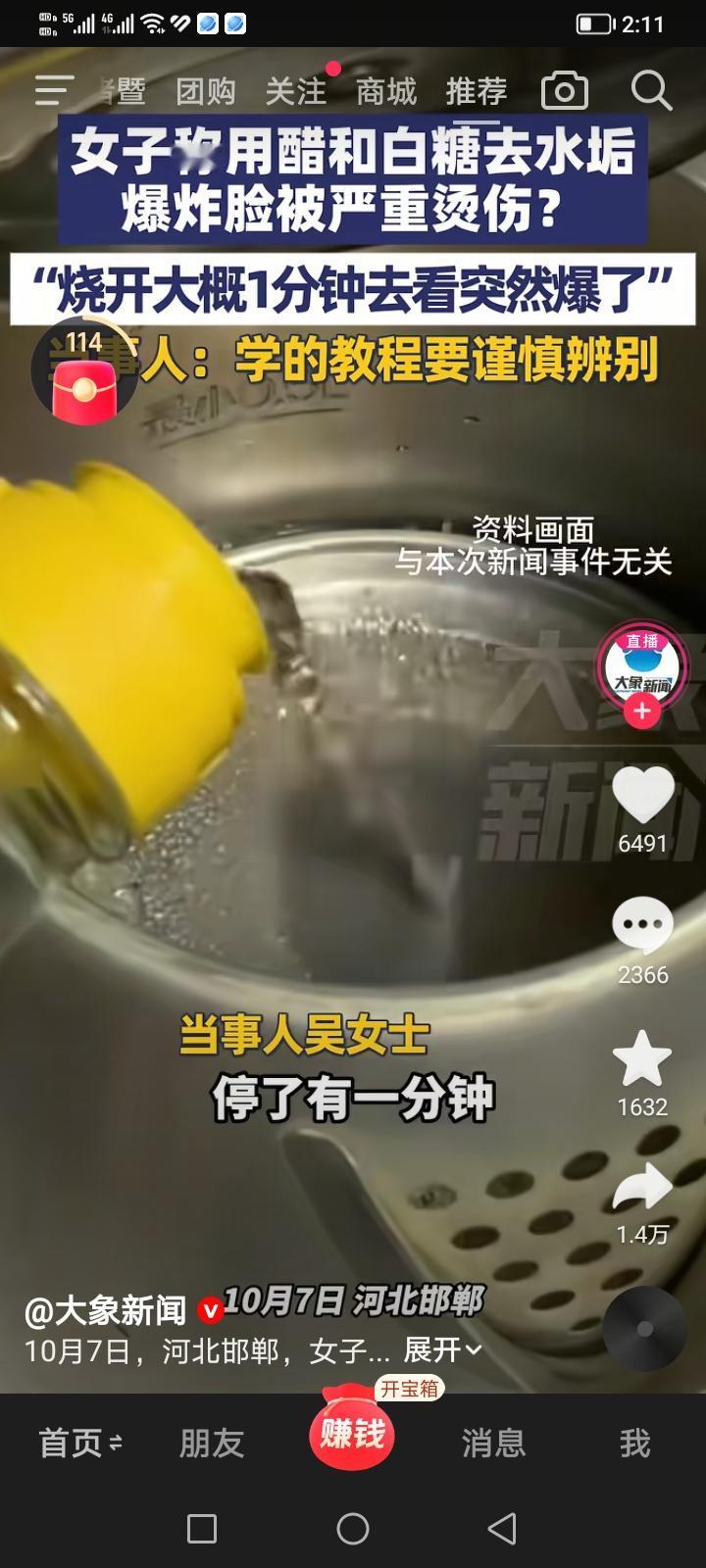 现在网上经常有一些博主教生活小妙招的,大家平时一定要注意安全,不要什么方法都信,有时候后果很严重。10月7日,河北邯郸的吴女士因模仿网络方法去除保温壶的水垢,导致面部被烫伤。 吴女士表示,她在网上搜到“白糖加白醋烧开”可以清除保安温壶内水垢的方法,于是将白醋、白糖和水烧开后的液体倒进保温壶中。约一分钟后,她在离壶两厘米的距离查看水垢去除效果时,壶内沸水突然爆炸,热水喷到脸上,造成面部烫伤。目前吴女士正在恢复中,她提醒网友们在参考网络生活技巧时应注意辨别,谨慎操作。生活小妙招 水垢清洁技巧 电水壶去水垢剂 水垢防治攻略