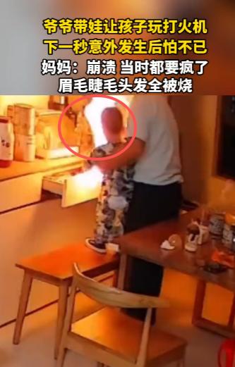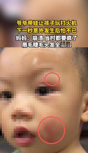 “悲剧还是发生了!”10月9日,湖南,一爷爷在家带孩子时给他玩打火机,下一秒打火机突然窜出巨大的火苗,孩子的眉毛睫毛头发全部被点着,脸上的皮肤也被烧伤,网友:不能让粗心的老人带孩子! 部分老人带孩子时安全意识比较浅薄,考虑问题不全面,他们往往会将危险物品给孩子玩,酿成的悲剧不计其数。 一位爷爷在家带孩子,他将孩子抱到凳子上,自己在抽屉里翻出一个打火机拿给孩子玩,谁知,按开打火机的一瞬间,忽然窜出了巨大的火苗,爷爷吓得赶紧将打火机丢在了地上。 这一切发生的太突然,当时打火机距离孩子的脸不足10cm,火苗冲出的瞬间就烧到了孩子的脸,爷爷的“补救措施”显然有点晚了。 据孩子妈妈说,自己看到家中的监控时直接崩溃了,孩子的半边脸被烫伤,脸颊和眼皮红肿,眉毛睫毛甚至是前额的头发都被火烧到。 这打火机应该是太久没用出了故障,才导致发生这种事情,估计老人也没想到小小的火机竟然能喷出如此大的火,幸好孩子受的伤不算太严重,火也及时熄灭。 不少网友认为这位爷爷太不靠谱了,如果需要把孩子给老人带,一定要和老人讲好不要给孩子玩危险物品! 信息来源:《爷爷带娃让孩子玩打火机,下一秒意外发生,妈妈:当时都要疯了》观象视频