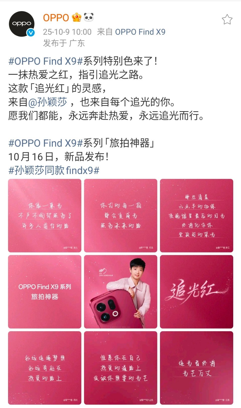 OPPO Find X9系列这次用”追光红“命名新手机配色,就像是孙颖莎在球台上朝着每一个胜利的光奔跑,OPPO和我们在台下跟着她的身影追光,共同奔赴属于我们的盛宴,感谢OPPO Find X9 系列给孙颖莎定制的追光红!孙颖莎同款findx9