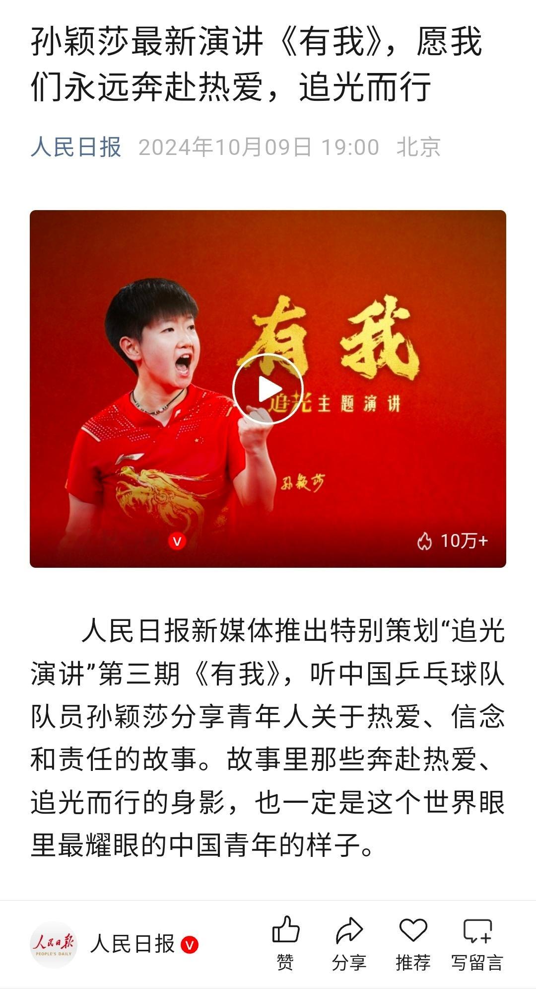 「追光红」的名字,和人民日报庆祝新中国成立75周年特别策划的孙颖莎追光演讲《有我》有关,对于孙颖莎的球迷来说,红色并不仅仅是简单的颜色,是赛场上她红色战袍映着灯光的耀眼、是因她站到最高领奖台升起的五星红旗、是她每次得分夺冠后我们眼里忍不住亮起的雀跃。