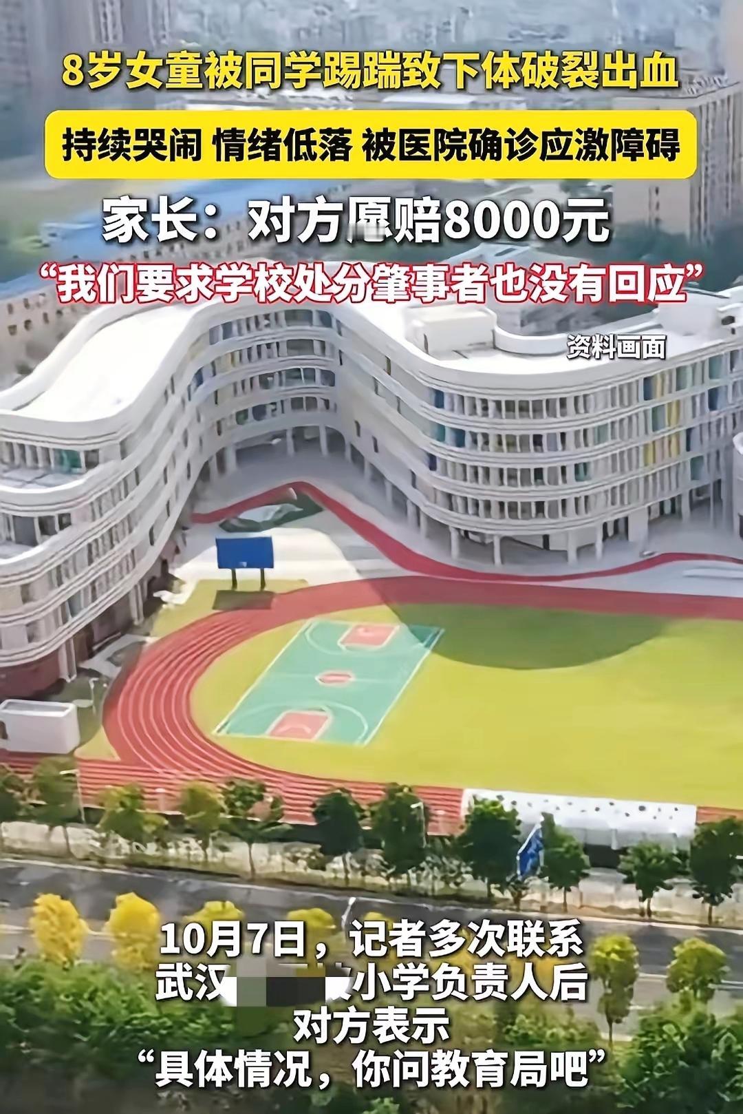 8岁女孩在学校被同学踢踹下体致破裂出血,还落下应激障碍,这事看得人血压直飙!更气人的是后续:对方家长只肯赔8000块,学校一句“问教育局”就把责任推干净。 别光骂施暴者年纪小,这根本是三方失职的大问题。施暴孩子的家长拿“未成年”当挡箭牌,8000块连医疗费都不够,哪配谈“赔偿”?这分明是没教好孩子也不想担责。 学校的锅更甩不掉,课间没人及时制止,出事后不处分、不调解,满脑子只想推卸责任。教育部早有规定,学校对学生有管理保护责任,这种冷漠处理就是失职[__LINK_ICON]。 所谓的“未成年免责”,绝不能变成伤人者的保护伞,更不能让学校成了甩手掌柜。孩子的身体和心理创伤要养一辈子,这账怎么算?你们觉得该怎么让失职方真正担责?
