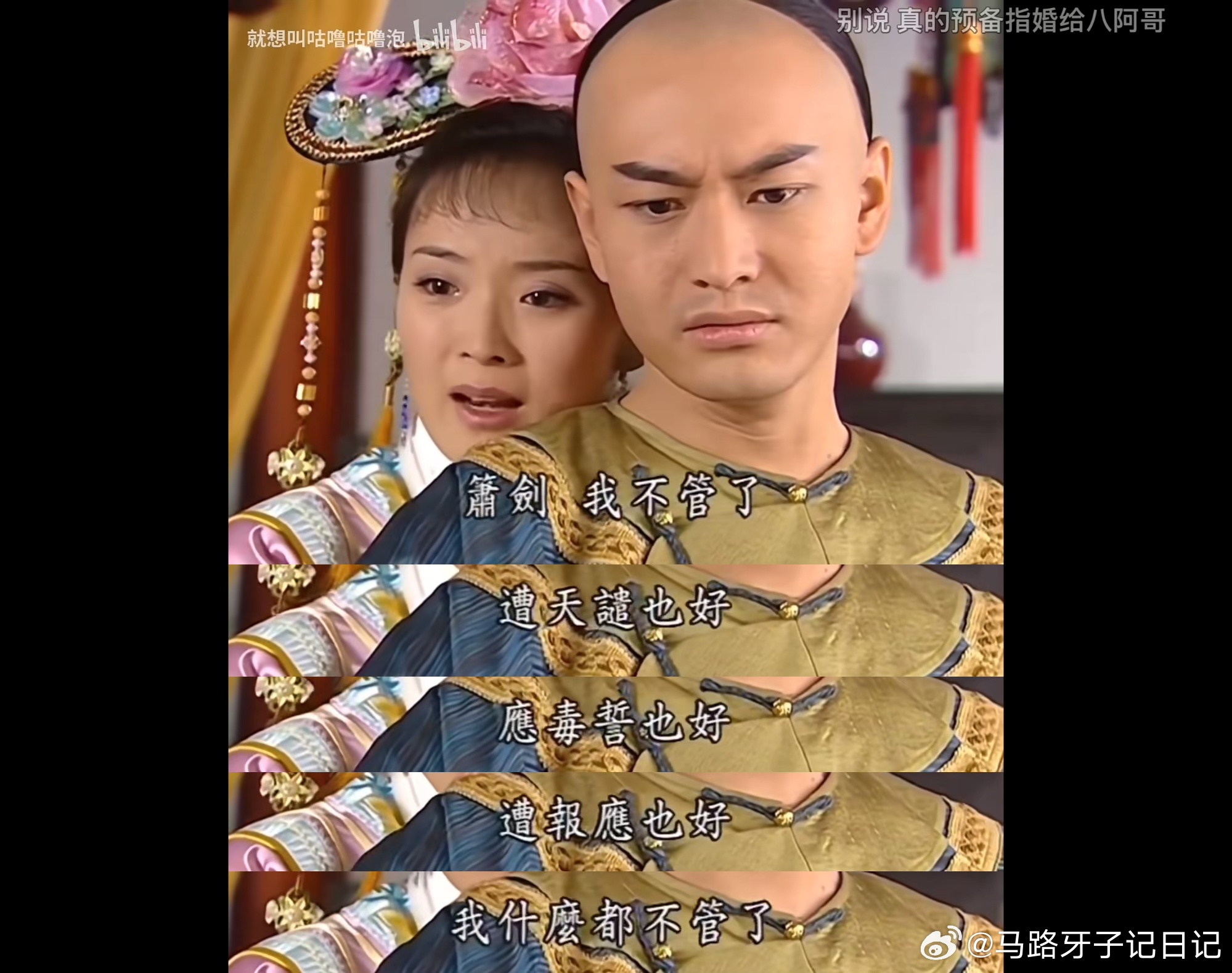 箫晴也是一对妙人。老说康薇箫晴四人怎么混搭都好吃但细看两对完全不同。 霸总型娇夫箫剑:让我堕落吧!生是晴儿的人,死是晴儿的鬼!😡 女魔头晴儿:老佛爷:你敢用箫剑生命发誓吗?(疑问句,有转还空间)晴儿毫不犹豫:箫剑五马分尸!😳老佛爷尔康手:我信你了!(别说了🫷)n集后:箫剑我不管了!遭报应也好我什么都不管了!😠 第二季皇阿玛为香妃让紫薇拿尔康发毒誓(逼迫语句、设定好毒誓内容让紫薇复述。这也能看出来老佛爷晴儿的亲情大概是还珠全系列最坚固的,也是何必骨肉亲)的时候紫薇思想斗争痛苦半天,失明也不忘自责是当初用尔康发誓造的孽(所以紫薇一直道德感太强容易内耗,第三季只有康薇幸福时她的犯罪感和恐惧被放大在情理之中)。 尔康属于脑筋活络又坚决不做半点有损紫薇的事儿的,主动把自己和老子儿子抬出来为小燕子箫剑发誓担保,偷偷绕过老婆老妈。抢答,让老佛爷无话可说(。