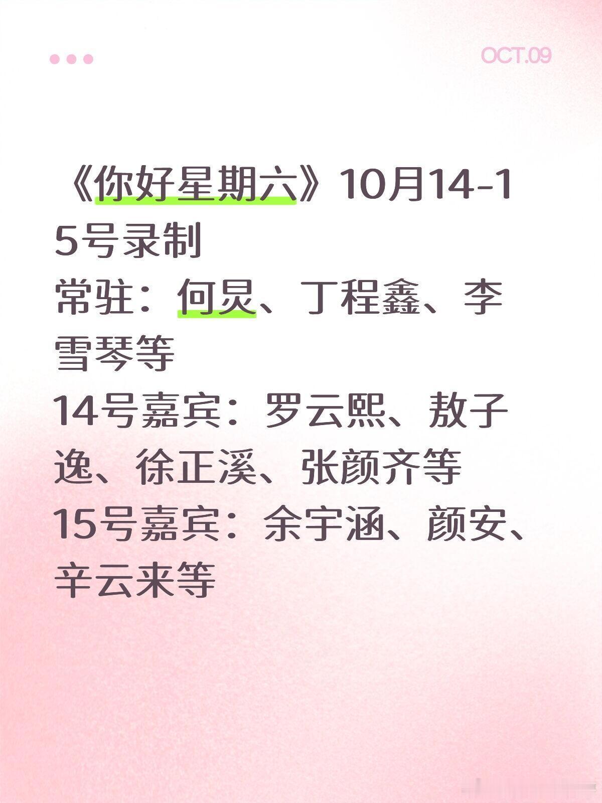 《你好星期六》10月14-15号录制常驻:何炅、丁程鑫、李雪琴等