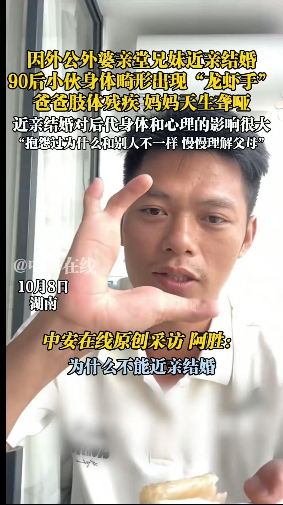 湖南,男子的外公外婆是堂兄妹,属于近亲结婚,他出生后身体出现畸形,患有龙虾手。他呼吁大家不要近亲结婚,这会对后代的身体和心理造成很大影响。他最初也抱怨过自己为何与别人不同,但现在已慢慢理解父母、接受现实,努力好好生活。 这位90后男子最近在社交媒体上公开了自己的身体情况,他向大家展示了自己的手——并非正常的五个手指,而是形似螃蟹的钳子,他自己称之为“龙虾手”。 他对着镜头缓缓讲述自己的遭遇,称外公外婆是亲堂兄妹,这种情况属于法律禁止的近亲结婚。但在那个年代,他的外公外婆还是结为了夫妻。 他们生下的女儿,也就是男子的妈妈,天生聋哑。他认为,这与外公外婆近亲结婚有关。 男子的妈妈因天生残疾,在选择伴侣时存在局限,最终嫁给了同样肢体残疾的丈夫。 不过,只要两人真心相爱,通过共同努力也能把日子过好。 但他们生下的男子也出现了身体畸形:除手脚外,其他部位均正常,手部是龙虾手,脚部也存在类似畸形。 男子最初十分郁闷,抱怨自己的人生,抱怨自己的身体为何与他人不同。 他甚至曾和父母大吵,认为是父母影响了自己的生活,毁掉了自己的一生。 父母看着儿子这样,心里也十分痛苦。其实他们自身也身患残疾,虽然能理解儿子的想法和心情,却无能为力。 随着年龄增长,男子开始不断探寻自己身体畸形的原因,最终得出结论:可能是外公外婆近亲结婚,导致母亲那一代就出现了健康问题,而到了自己这一代,也出现了畸形。 他将自己和母亲的遭遇归因于外公外婆,但并非责怪他们——在那个年代,这类情况或许确实存在,因为相关的科普宣传不够普及。 他只是想把自己的经历分享出来,提醒大家不要近亲结婚,以免给后代带来身体和心理上的双重伤害。 网友们因此展开热议:男子的畸形,究竟是母亲天生聋哑、父亲肢体残疾结合导致的后果,还是外公外婆那一代近亲结婚埋下的隐患? 当然,更多人认为原因出在外公外婆身上,可能是他们的基因已发生变异,才导致后代出现健康问题。 不过,这也只是一种概率事件。有些人身边也有近亲结婚的情况,但他们的孩子却非常健康,后代也很聪明。 但即便如此,也绝不建议近亲结婚,而且我国婚姻法明确禁止近亲结婚,若发现双方属于近亲关系,根本无法领取结婚证。 对于男子的遭遇,大家除了同情,更希望他能积极面对生活。毕竟,龙虾手虽然看起来与正常人不同,但对日常生活造成的影响其实有限,相比其他严重畸形,已经算是比较幸运的情况了。 而男子发布视频的目的并非诉苦,只是想分享自己的经历,同时希望大家引以为戒,坚决避免近亲结婚。 男子的外公外婆是堂兄妹,在法律上这就是妥妥的“近亲”。 我国《民法典》第一千零四十八条写得明明白白:直系血亲或者三代以内的旁系血亲,禁止结婚。 啥叫三代以内旁系血亲? 简单讲,就是往上数三代,你们有同一个祖先,像堂兄妹、表兄妹,都在这个圈里。 这俩人的关系,正好踩了法律红线,他们的婚姻从根儿上就不被法律认可。 可能有人会说“那时候不懂法”,但法律为啥禁止近亲结婚?核心就是为了避免这家人遇上的悲剧。 血缘太近的人结婚,基因里藏着的病、缺陷,容易传给下一代,生出来的孩子得遗传病、畸形的概率会大很多。 这男的妈妈天生聋哑,他自己是龙虾手、脚也畸形,大概率就是这种基因遗传风险闹的。 再看《民法典》第一千零五十一条,直接把“有禁止结婚的亲属关系”列为婚姻无效的情况。 这意思就是,就算当年他外公外婆办了结婚手续,这段婚姻在法律上也是无效的,从头到尾都不受保护。 法院要是碰到这种事,会直接宣告婚姻无效,而且关于婚姻效力的事,没法调解,必须按法律判。 有人纠结“是他爸妈残疾导致的,还是外公外婆近亲结婚导致的”,但从法律和医学的逻辑来讲,近亲结婚才是根源性的风险。 法律早把这条路堵死了,就是为了从源头减少这种家庭悲剧——毕竟孩子一旦出了健康问题,对家庭、对孩子的伤害,那是一辈子的事,就像这家人经历的这样。 所以不管过去还是现在,堂兄妹、表兄妹这种关系,绝对不能结婚。这不光是违伦理,更是实打实的违法,最后遭罪的还是后代。 对于此事,大家如何看? 素材:中安在线2025年10月8日报道。