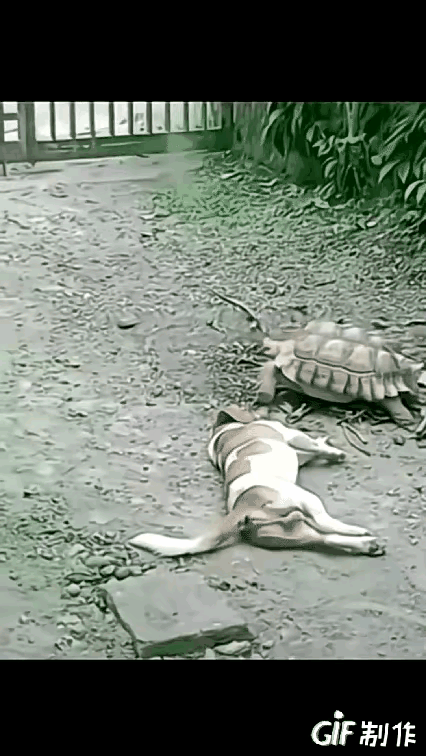 你瞧!一只乌龟在沙石地上慢悠悠地爬着,那模样别提多自在了。 一只正在打盹儿的狗狗,被路过的乌龟给弄醒了。 看到慢悠悠的乌龟,狗狗一下子来了精神,直接四肢伏地,学起乌龟的样子。 这画面太逗了,乌龟还停下来,扭头看着狗狗,仿佛在说:“小家伙,我可比你爷爷岁数都大,还跟我开玩笑呢!” 你说,这狗狗是不是太有意思了,也许它是对乌龟这种慢悠悠的生活方式感到好奇。 其实啊,生活中这样的小趣事不少,就看咱们有没有留意。 这也提醒咱,多关注身边这些小美好,日子能乐呵不少。 你们身边有没有动物之间这种有趣互动呢,快说来听听!
