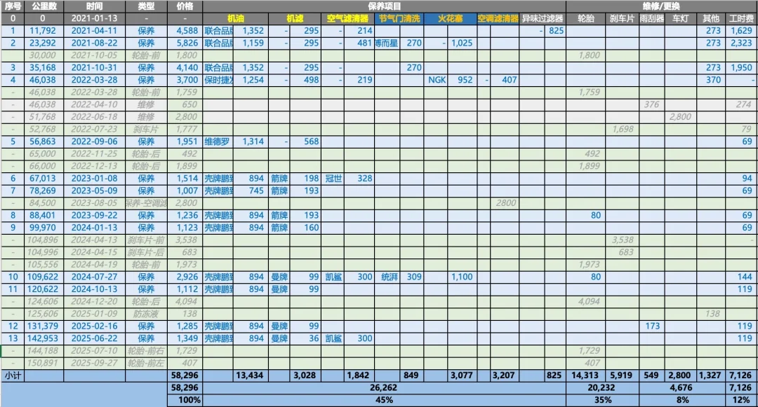 回头看下来,15万公里保养,维修等等加起来差不多6万(国庆跑完,最近下一次保养了)其中: