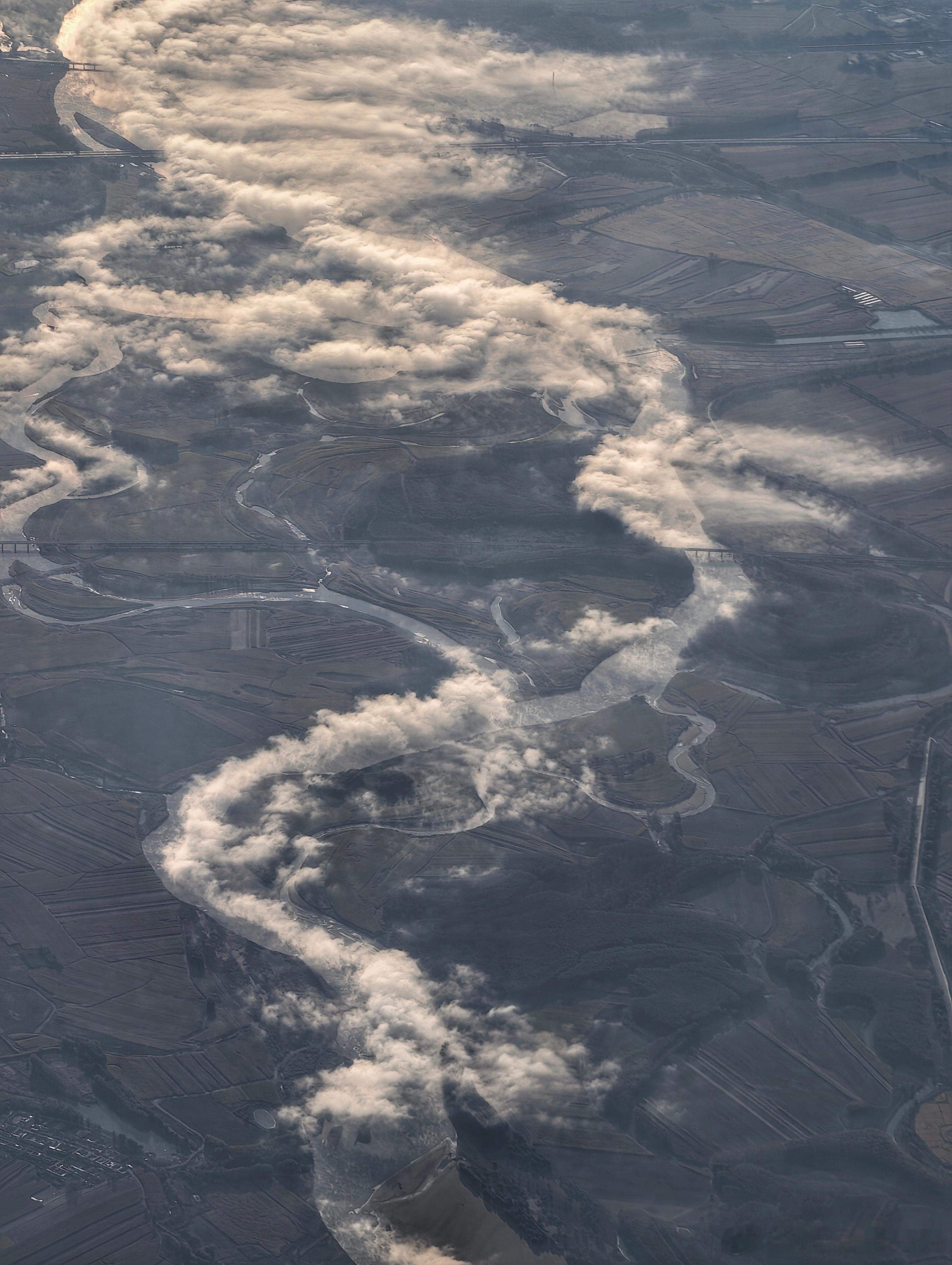 早晨飞离哈尔滨拍的云雾仿若一条大龙盘旋在河流之上黑龙江or白龙江?