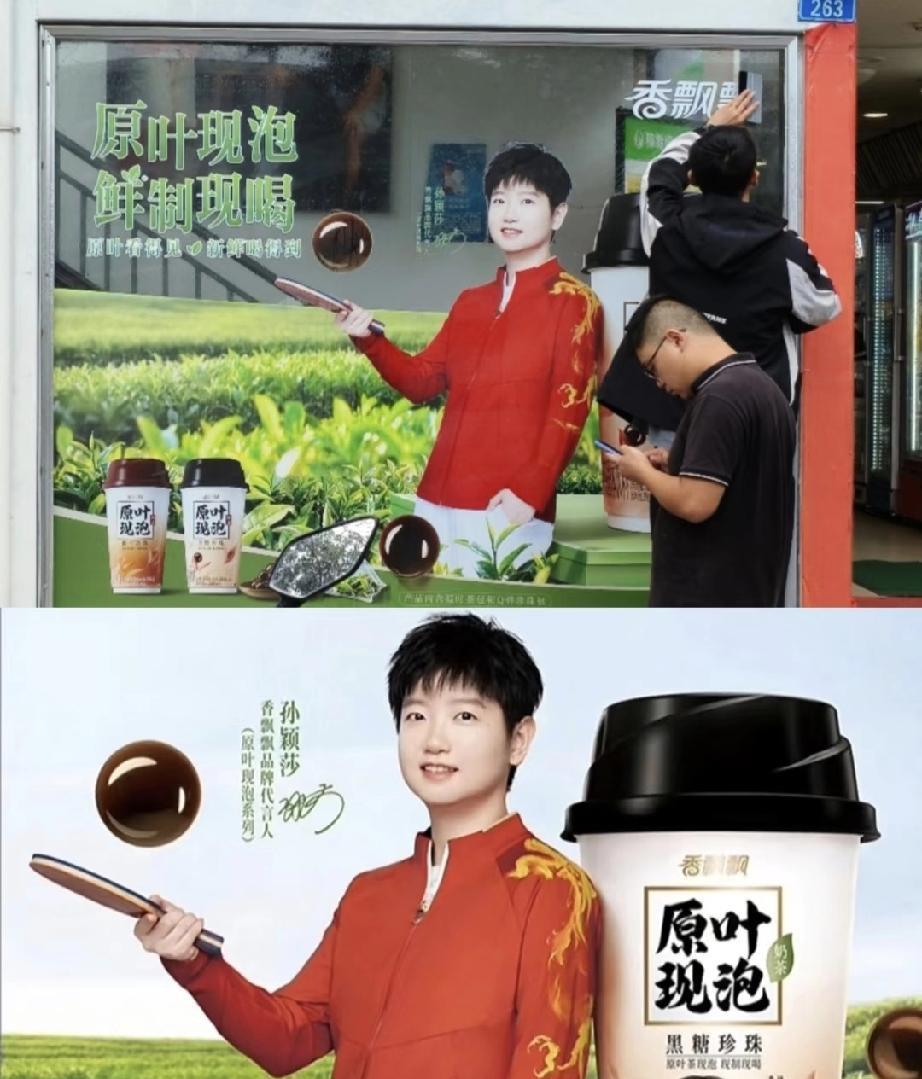 孙颖莎最新代言香飘飘即将官宣!线下门店也已经开始布置孙颖莎相关宣传海报! 这次竟