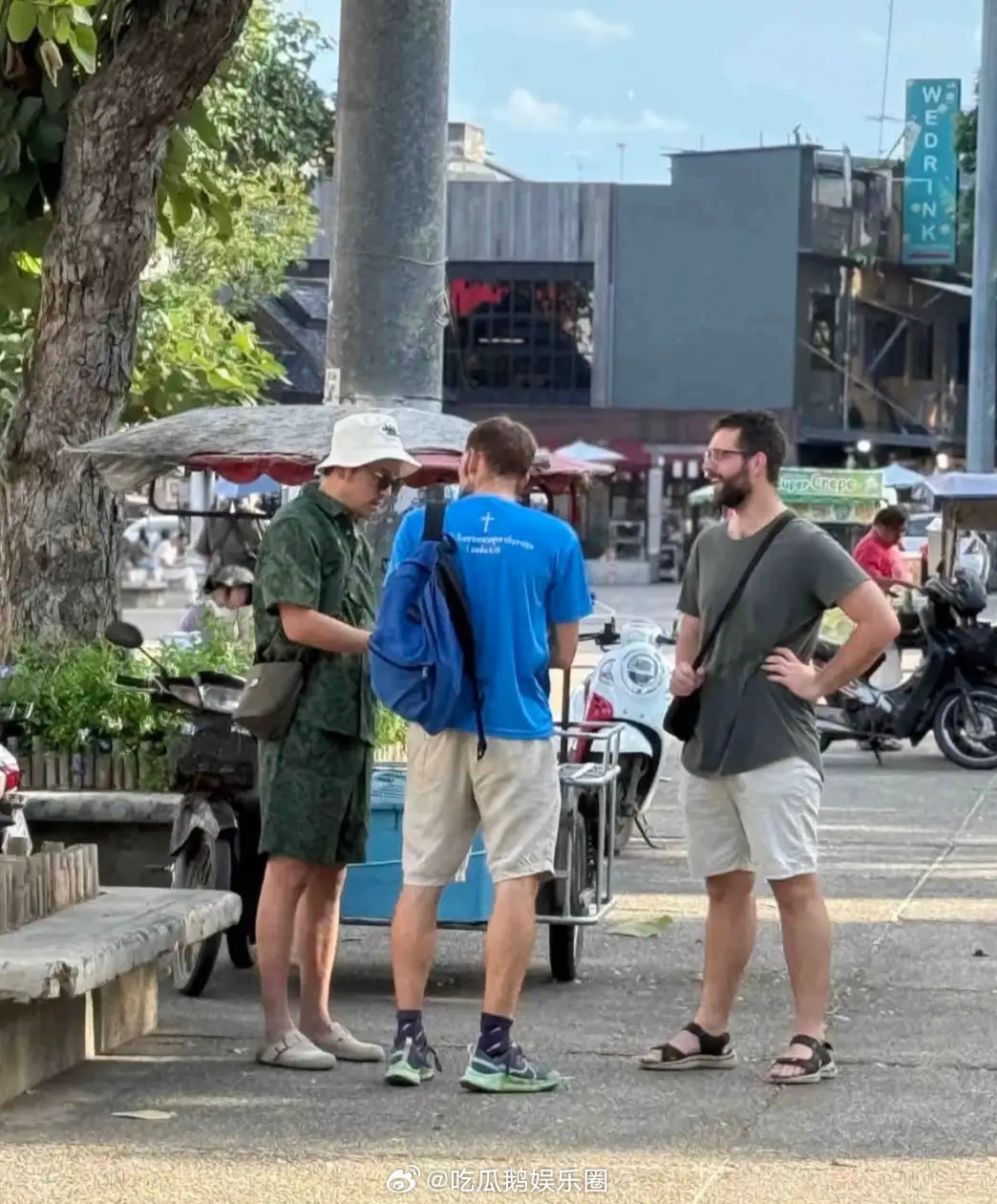 42岁雷佳音和老婆翟煦飞在泰国曼谷旅游,夫妻俩穿一身热带风衣服,在大白天牵着手逛闹市,背影看起来很般配,身高差好萌! ​​​