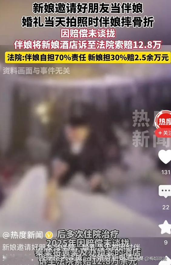陕西,秦某和黄某是好闺蜜。黄某婚礼上秦某当伴娘。拍照时三人站沙发,沙发滑动致三人后仰摔倒,秦某受伤最重,右尺桡中段 粉 碎 性 骨 折。她拒绝 住 院,3个月后复查手臂问题严重,因赔偿谈不拢,秦某将黄某和酒店告上法庭索赔12.8万。 秦某和黄某是一对无话不谈的好闺蜜,两人感情深厚,有什么事都会互相帮忙。 2022年10月1日,是黄某大喜的日子,她早早地就给秦某发去了邀请,希望秦某能当她的伴娘,秦某毫不犹豫就答应了,还精心准备了伴娘服。 婚礼当天,秦某早早来到黄某入住的酒店,帮着黄某忙前忙后,到了拍照环节,摄影师为了拍出更好的效果,让黄某和两个伴娘站到沙发上。 当时,谁也没想到危险正悄悄降临,三人刚站稳,沙发突然毫无征兆地向前滑动,三个人瞬间失去平衡,后仰着摔倒在地,现场一片混乱,大家都被这突如其来的意外惊呆了。 秦某伤得最重,她疼得脸色煞白,豆大的汗珠从额头滚落下来,众人赶紧把她送到 医 院,经过检查,医 生 诊 断 秦某 右 尺 桡 中 段 骨 折,还是尺 骨 粉 碎 性,建议她住 院 治 疗。 可秦某觉得自己年轻力壮,这点伤不算什么,拒绝了 医 生 的提议,只在手臂上做了石膏 夹板 固定,就匆匆离开了 医 院。 之后,秦某照常生活工作,也没太把伤当回事。 然而,2023年2月1日,当她去 医 院 复查时,医 生 告诉她,右上肢运动、感觉 功能 障 碍,右前臂 肌肉 萎 缩,以后工作都可能受影响。 秦某觉得这一切都是因为在黄某婚礼上受伤导致的,于是,她找到黄某,希望黄某能给她一定的赔偿。 可双方在赔偿金额上始终谈不拢,黄某觉得秦某自己也有责任,不应该让她承担全部费用。 秦某把黄某和涉事酒店告上了法庭,索赔12.8万元。 1,黄某作为婚礼举办方,对秦某受伤是否应承担责任,会受到什么样的处罚? 黄某举办婚礼,邀请秦某当伴娘,双方形成了一种临时性的活动组织关系。在这个活动中,黄某有义务保障参与者的安全。 根据民法典规定,宾馆、商场、银行、车站、机场、体育场馆、娱乐场所等经营场所、公共场所的经营者、管理者或者群众性活动的组织者,未尽到安全保障义务,造成他人损害的,应当承担侵权责任。 在本次事件中,黄某作为婚礼组织者,没有对拍照环境及设施的安全性进行充分检查和保障,导致沙发滑动致使秦某受伤,未尽到安全保障义务。 不过,秦某自身拒绝 住 院 治 疗,对后续伤情恶化可能也有一定影响,黄某也有一定的责任。 2,酒店作为经营场所管理者,是否对秦某受伤存在过错,会受到什么样的处罚? 酒店是婚礼举办的经营场所,对场所内的设施安全负有管理责任。 民法典同样规定,经营场所的管理者有安全保障义务。 若酒店提供的沙发存在质量问题或者摆放不合理等情况,导致沙发滑动造成秦某受伤,酒店就存在过错。 酒店作为经营场所,在活动进行过程中,也有一定的巡查和提醒义务。如果酒店没有尽到这些义务,也可能承担部分责任。 审理查明,酒店在本次事件中不存在足以导致其承担责任的过错。 最终判决,黄某赔偿秦某医疗费、误工费等各项费用共计25214.42元。